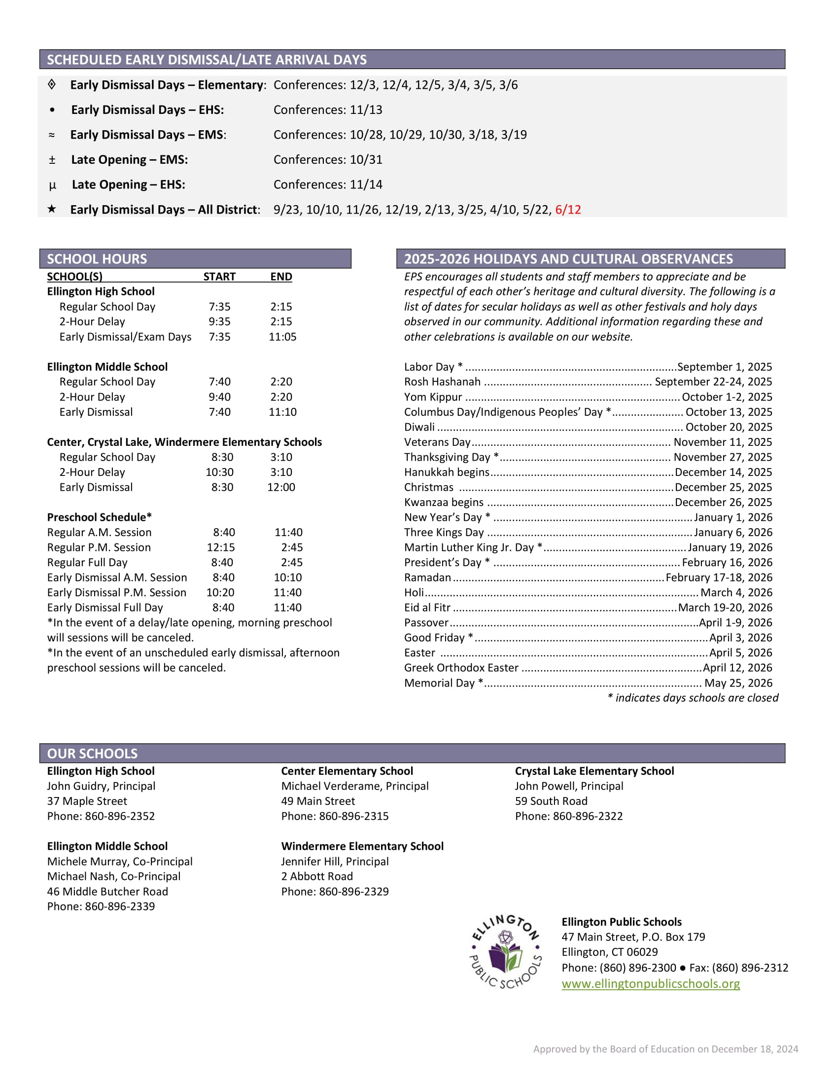Ellington Public Schools Calendar 2025-2026 FAQ