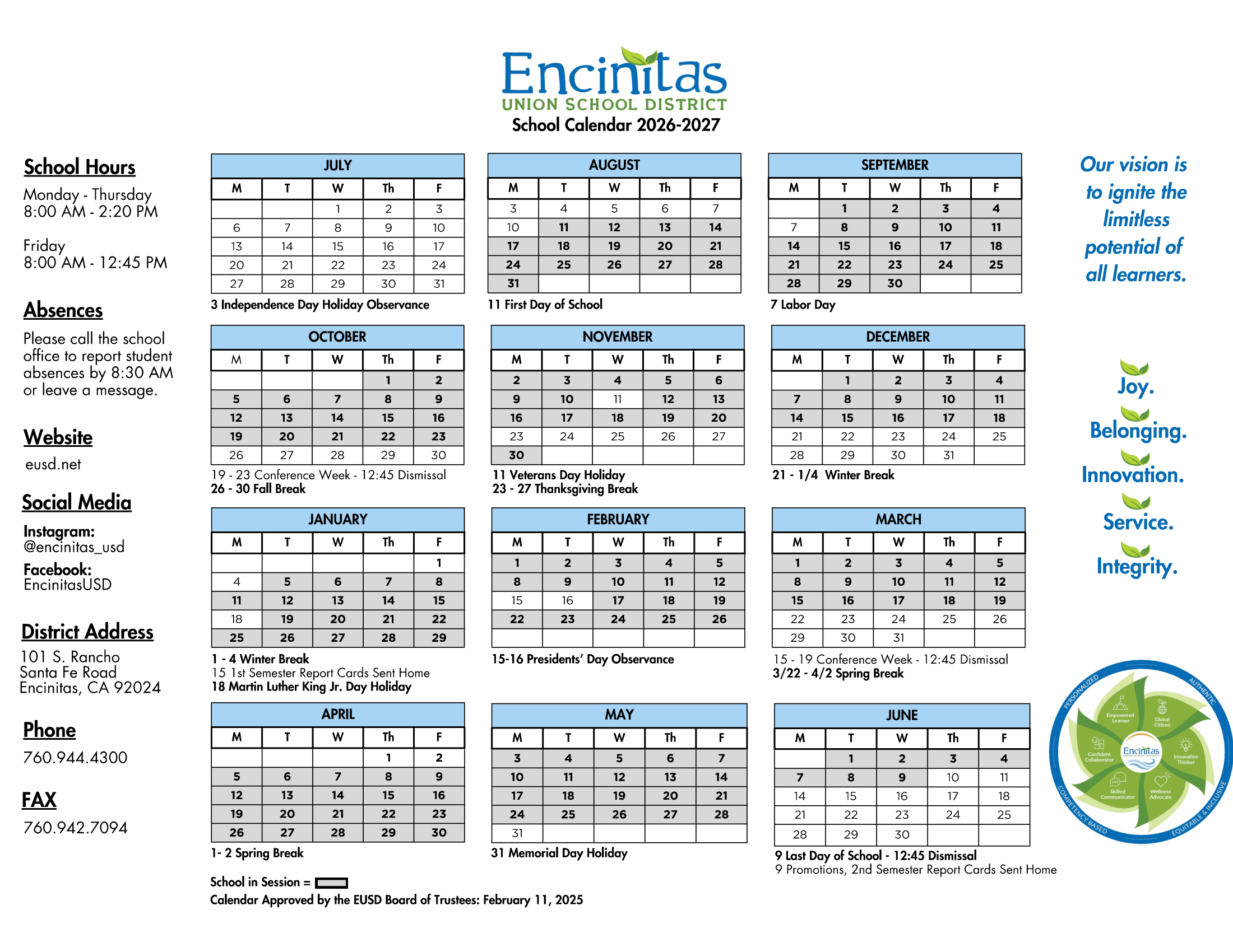 Encinitas Union School District Calendar (2026-2027)