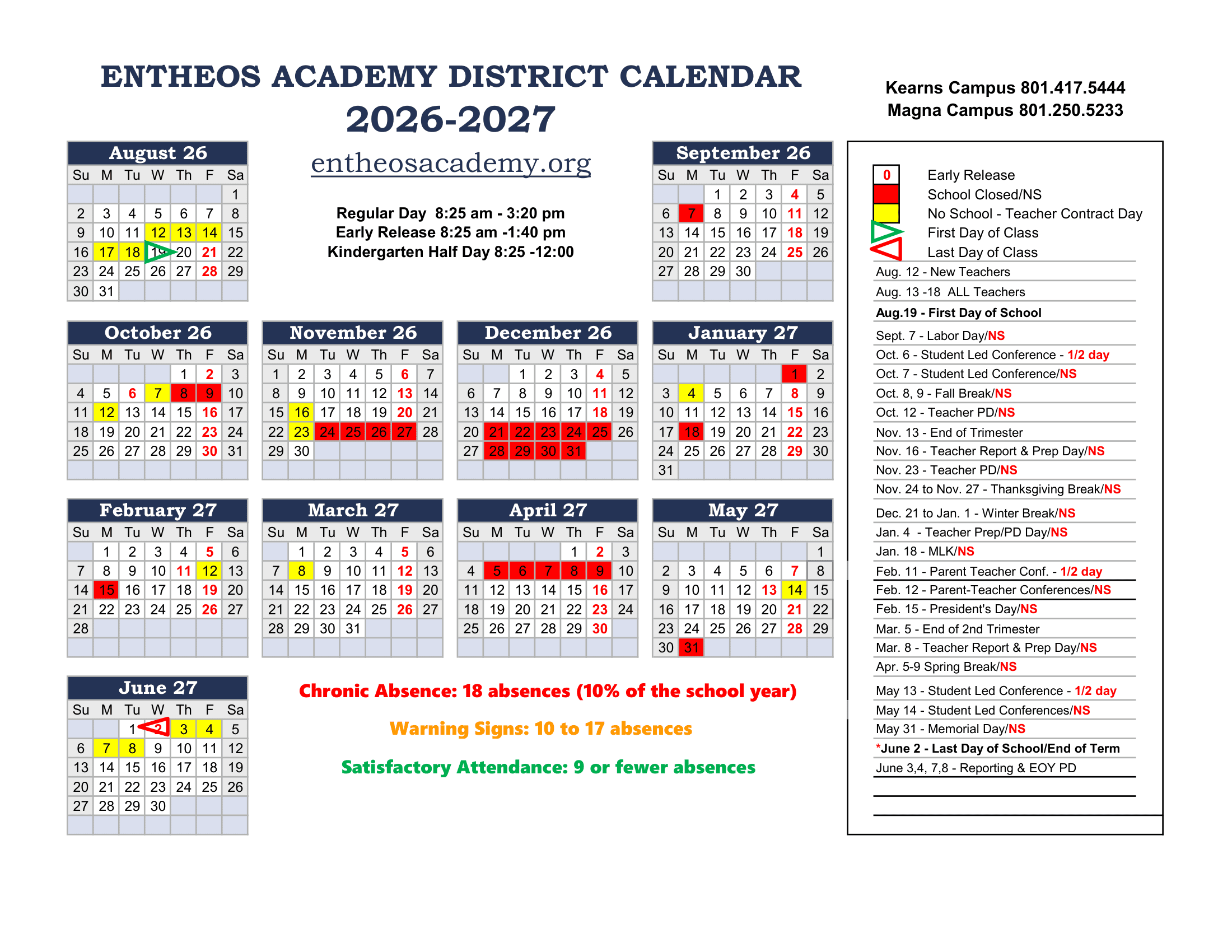 Dates are sourced from the official ENTHEOS ACADEMY DISTRICT ut 26-27 Calendar Revised [PDF] website. Dates may change at the discretion of the district. Always verify with the official school website for the latest updates.