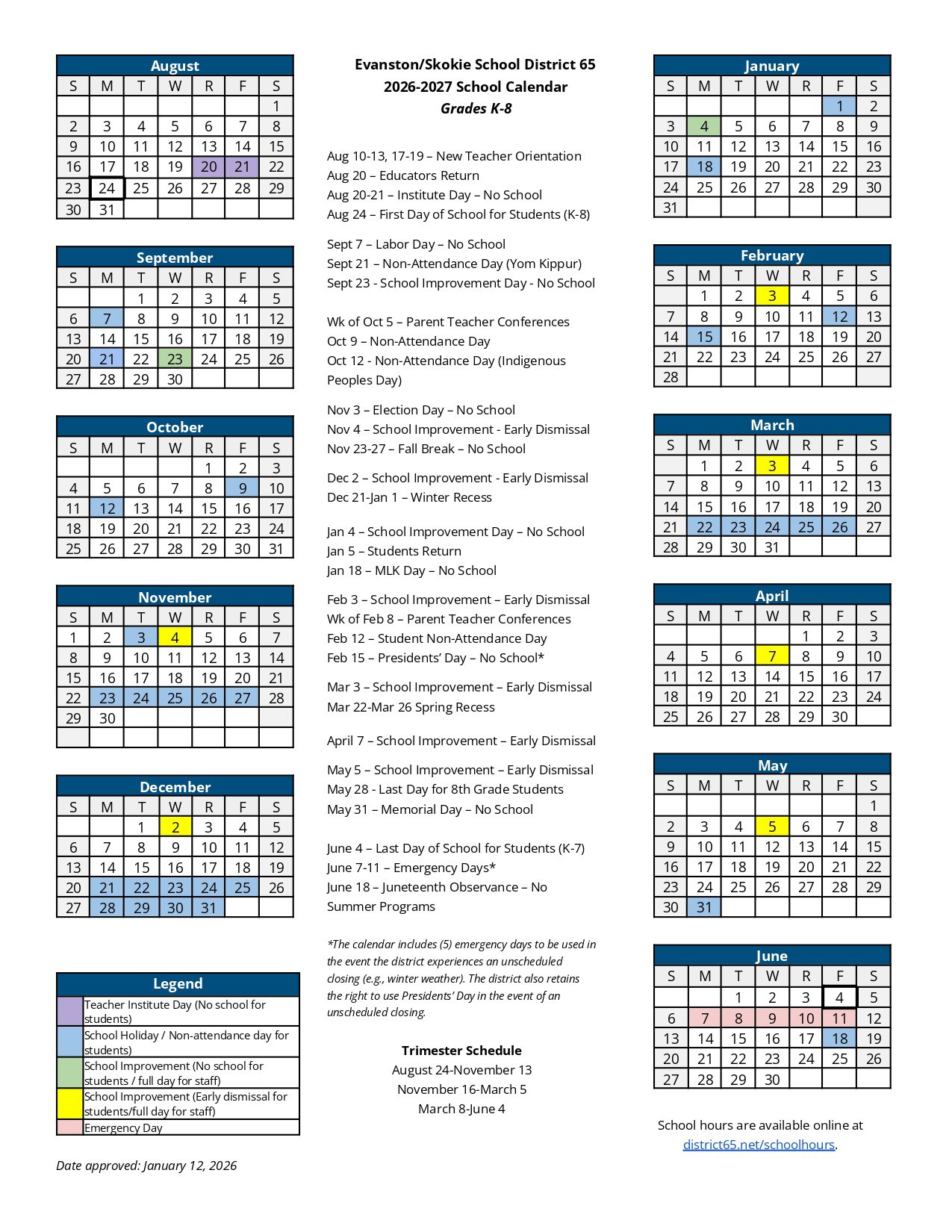 Dates are sourced from the official Evanston/Skokie School District 65 Calendar 26-27 Revised [PDF] website. Dates may change at the discretion of the district. Always verify with the official school website for the latest updates.