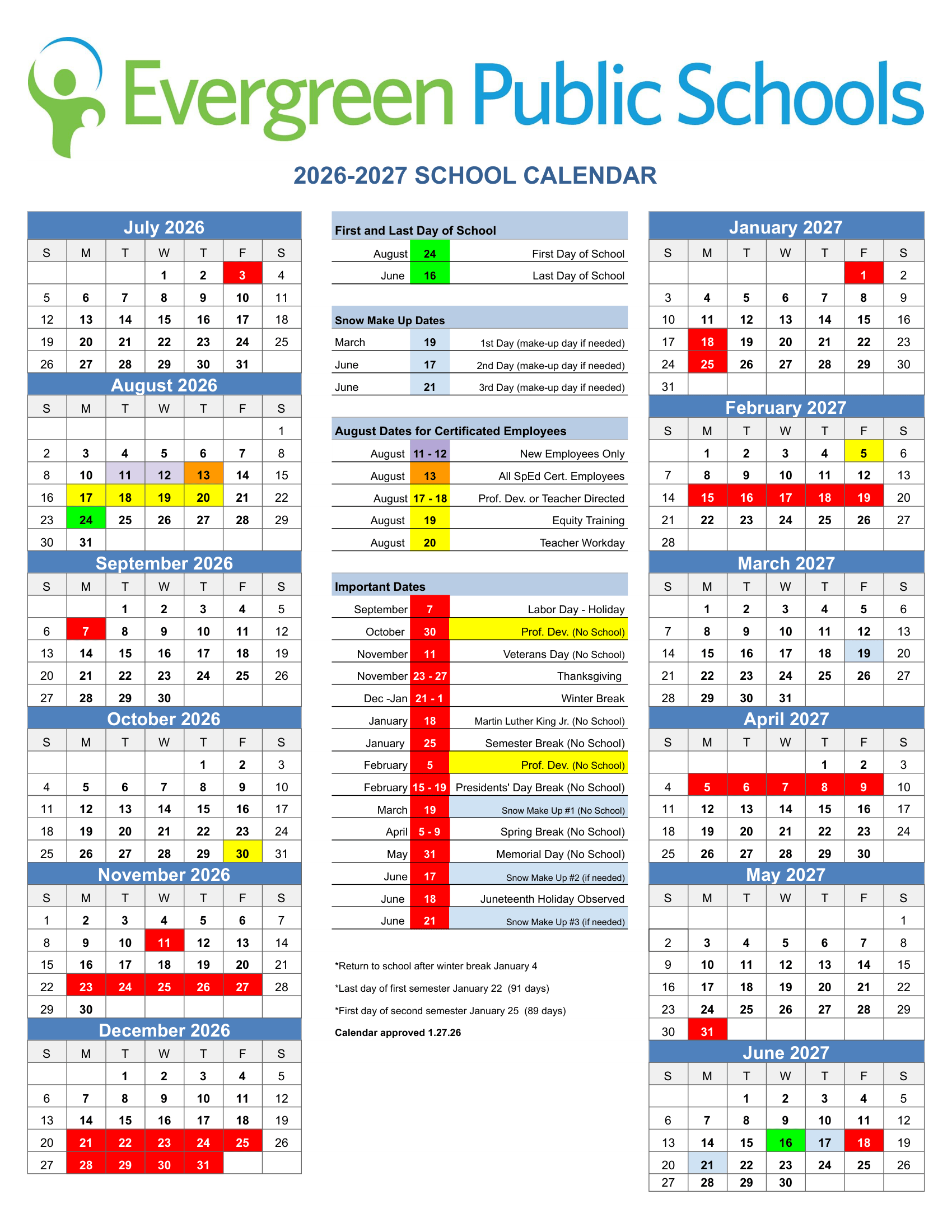 Dates are sourced from the official Evergreen Public Schools 26-27 Calendar Revised [PDF] website. Dates may change at the discretion of the district. Always verify with the official school website for the latest updates.