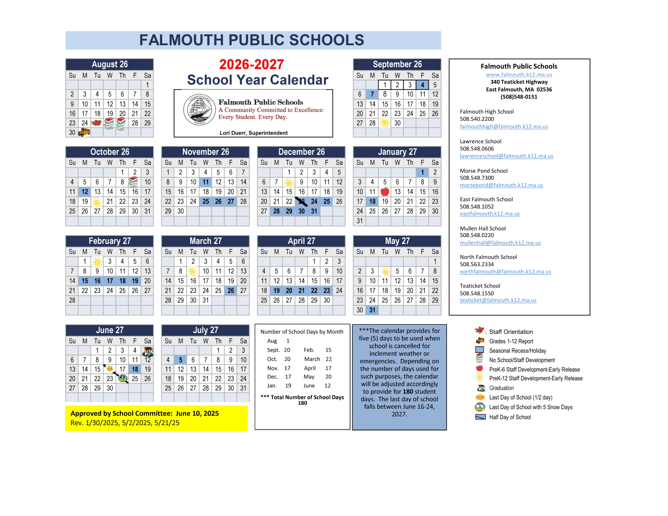 Dates are sourced from the official Falmouth Public Schools 26-27 Calendar Revised [PDF] website. Dates may change at the discretion of the district. Always verify with the official school website for the latest updates.