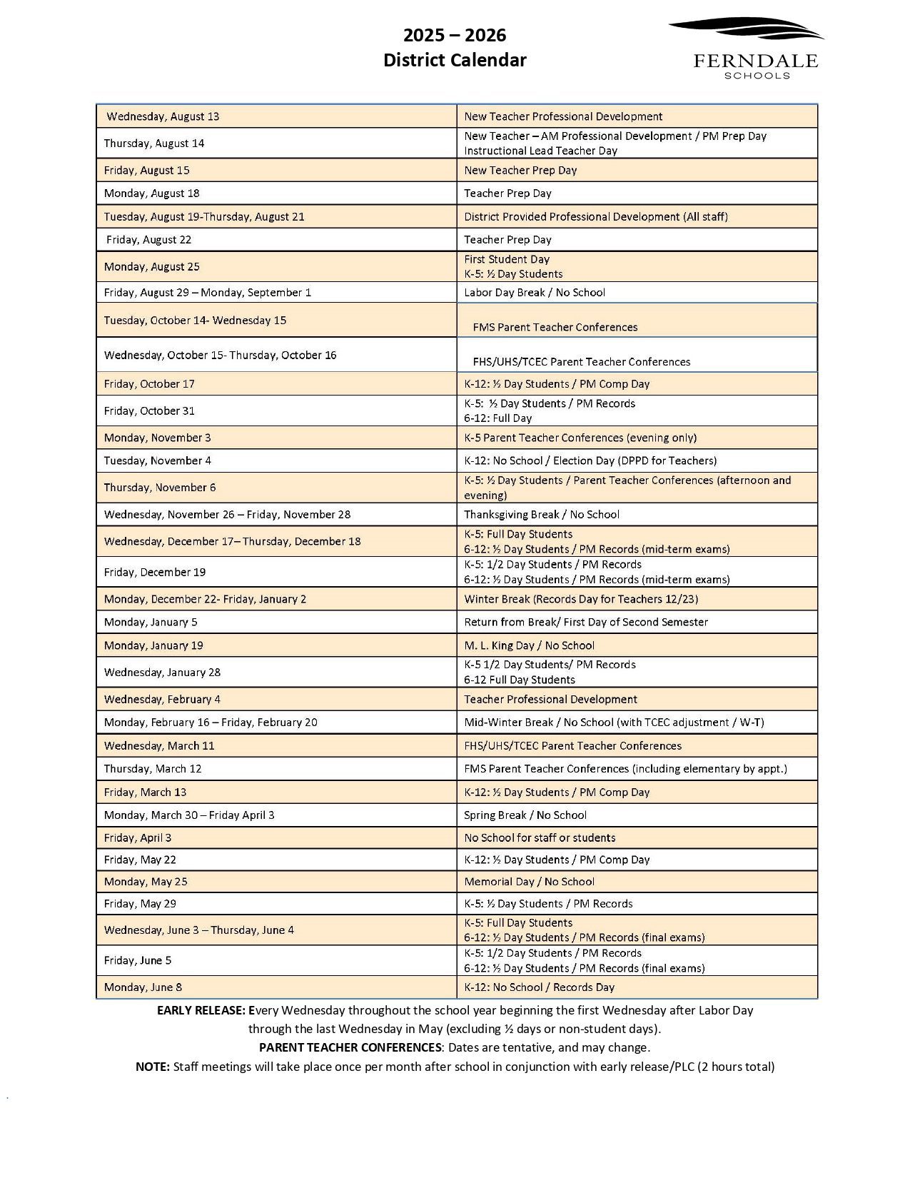 Ferndale Schools Calendar (2025-2026)