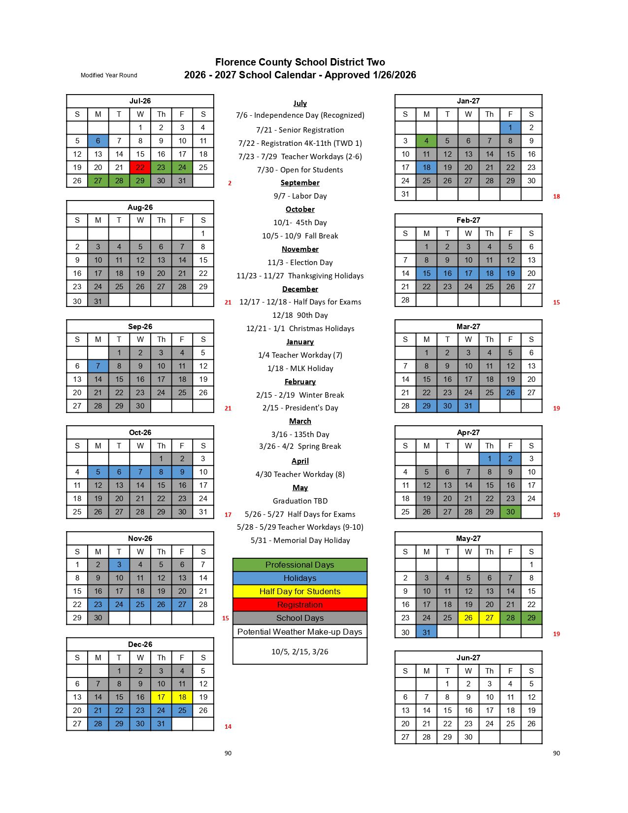 Dates are sourced from the official Florence County School District Two Calendar 26-27 Revised [PDF] website. Dates may change at the discretion of the district. Always verify with the official school website for the latest updates.