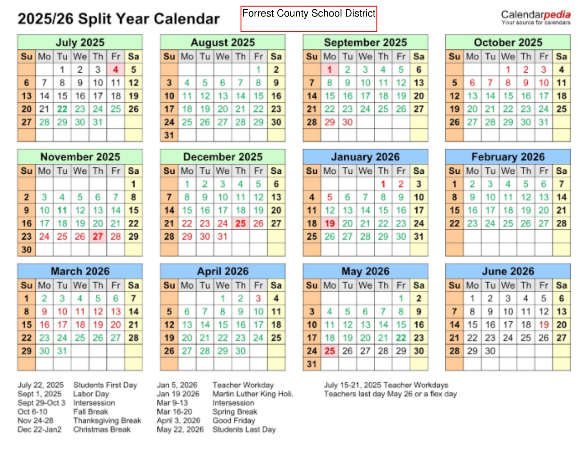 Forrest County School District Calendar (2025-2026)