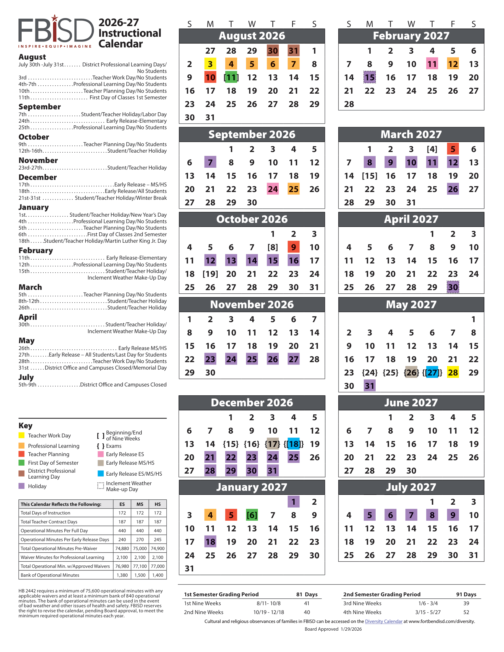 Dates are sourced from the official Fort Bend isd Calendar 26-27 Updated [PDF] website. Dates may change at the discretion of the district. Always verify with the official school website for the latest updates.