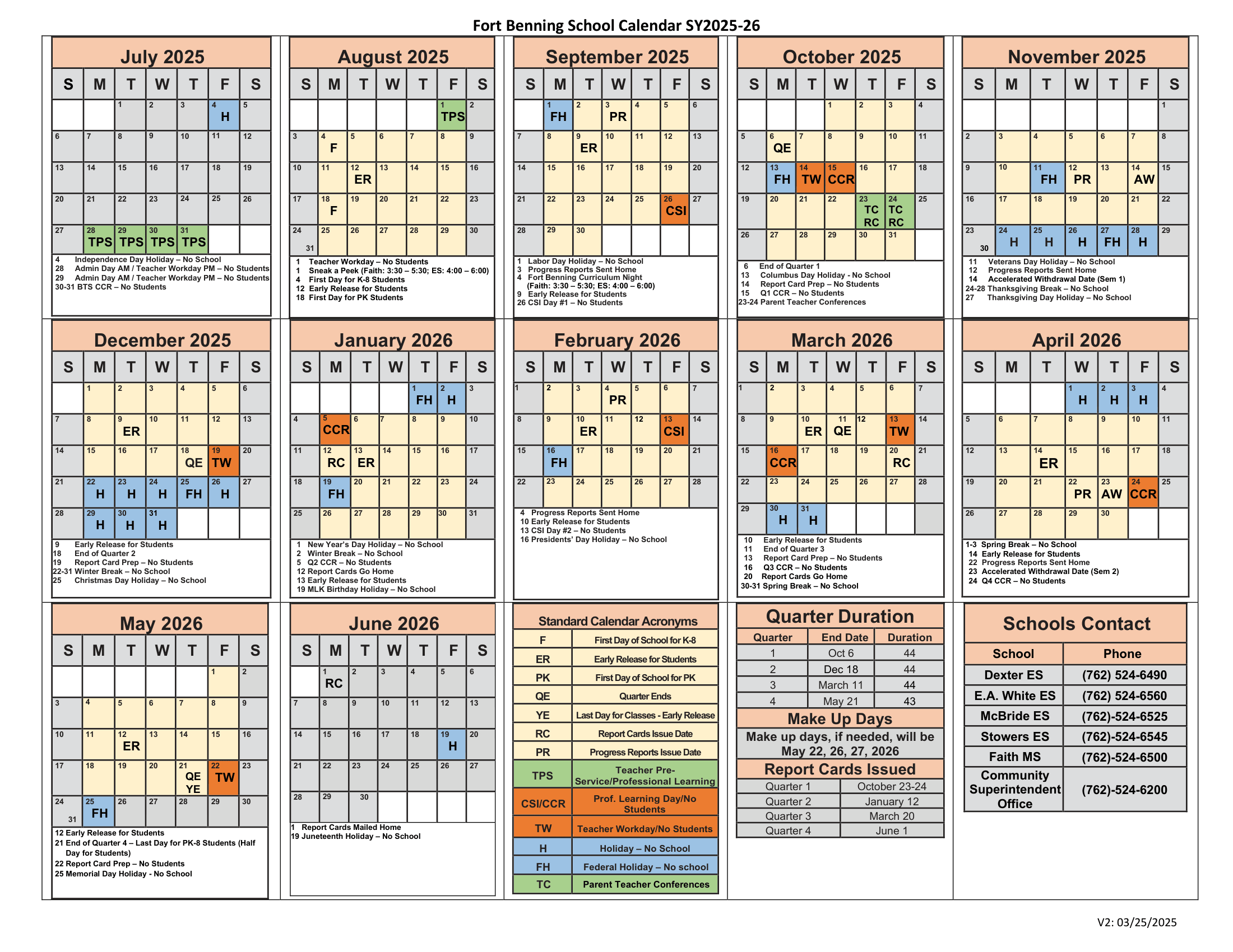 Dates are sourced from the official Fort Benning School Calendar 25-26 Updated [PDF] website. Dates may change at the discretion of the district. Always verify with the official school website for the latest updates.