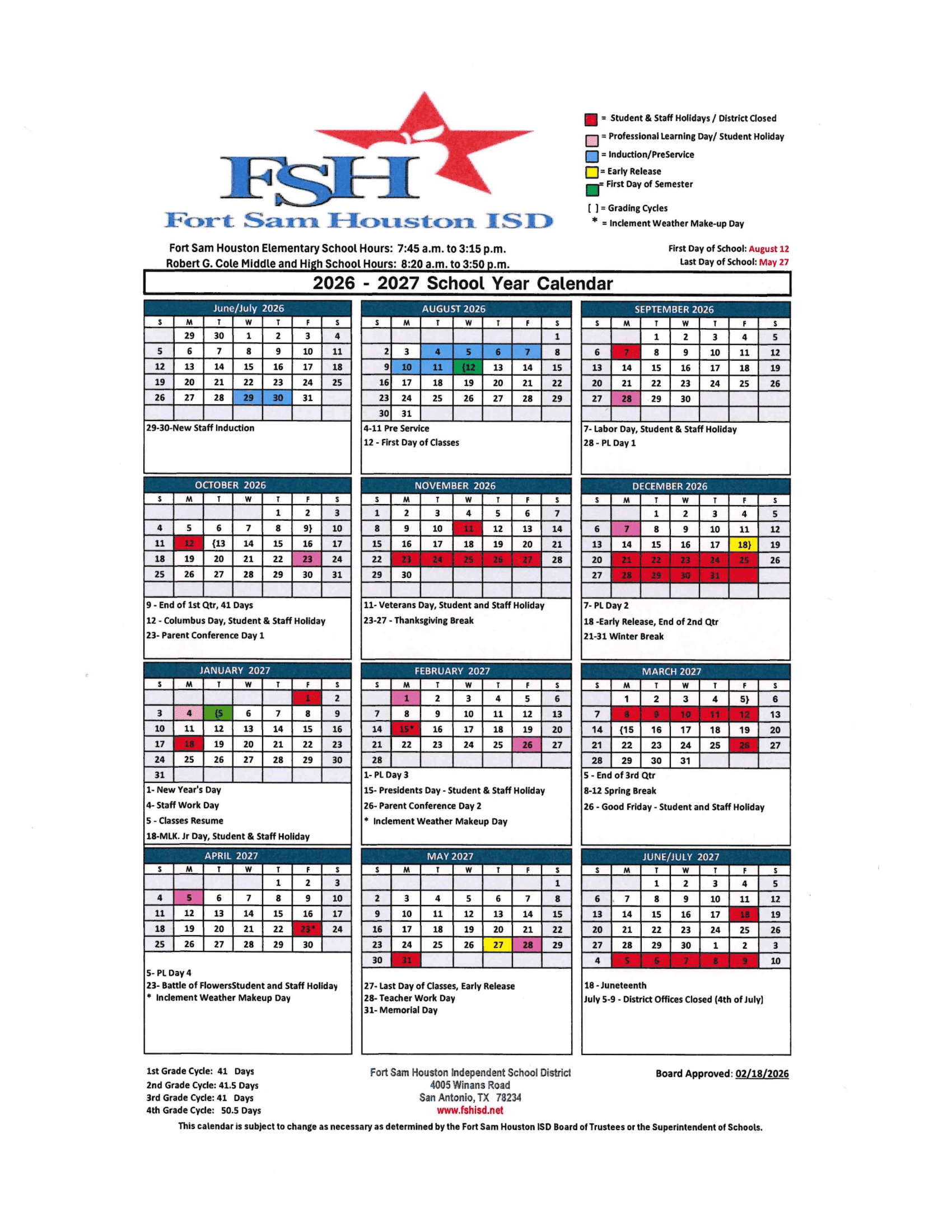 Dates are sourced from the official Fort Sam Houston ISD Calendar 26-27 Revised [PDF] website. Dates may change at the discretion of the district. Always verify with the official school website for the latest updates.