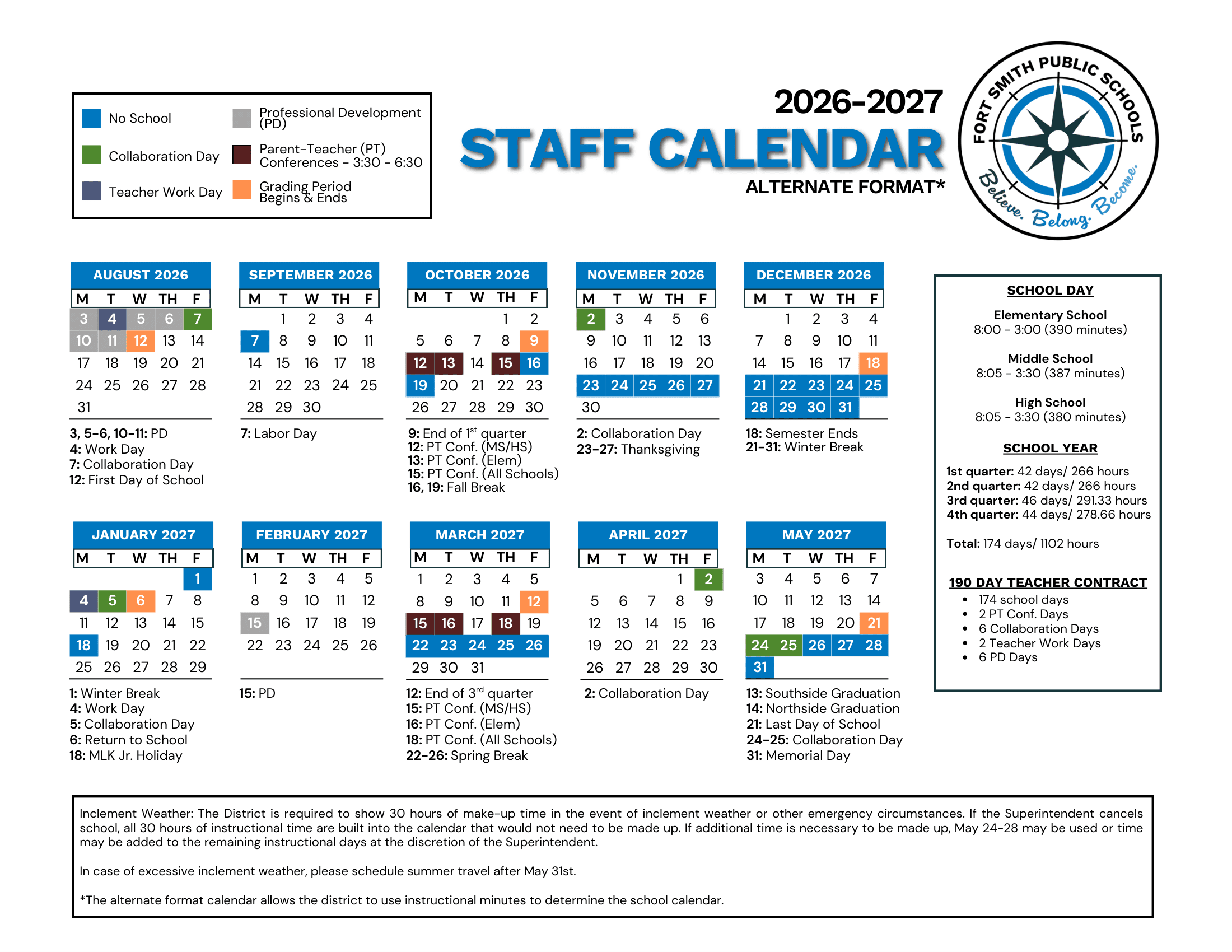 Dates are sourced from the official Fort Smith Public Schools 26-27 Calendar Updates [PDF] website. Dates may change at the discretion of the district. Always verify with the official school website for the latest updates.