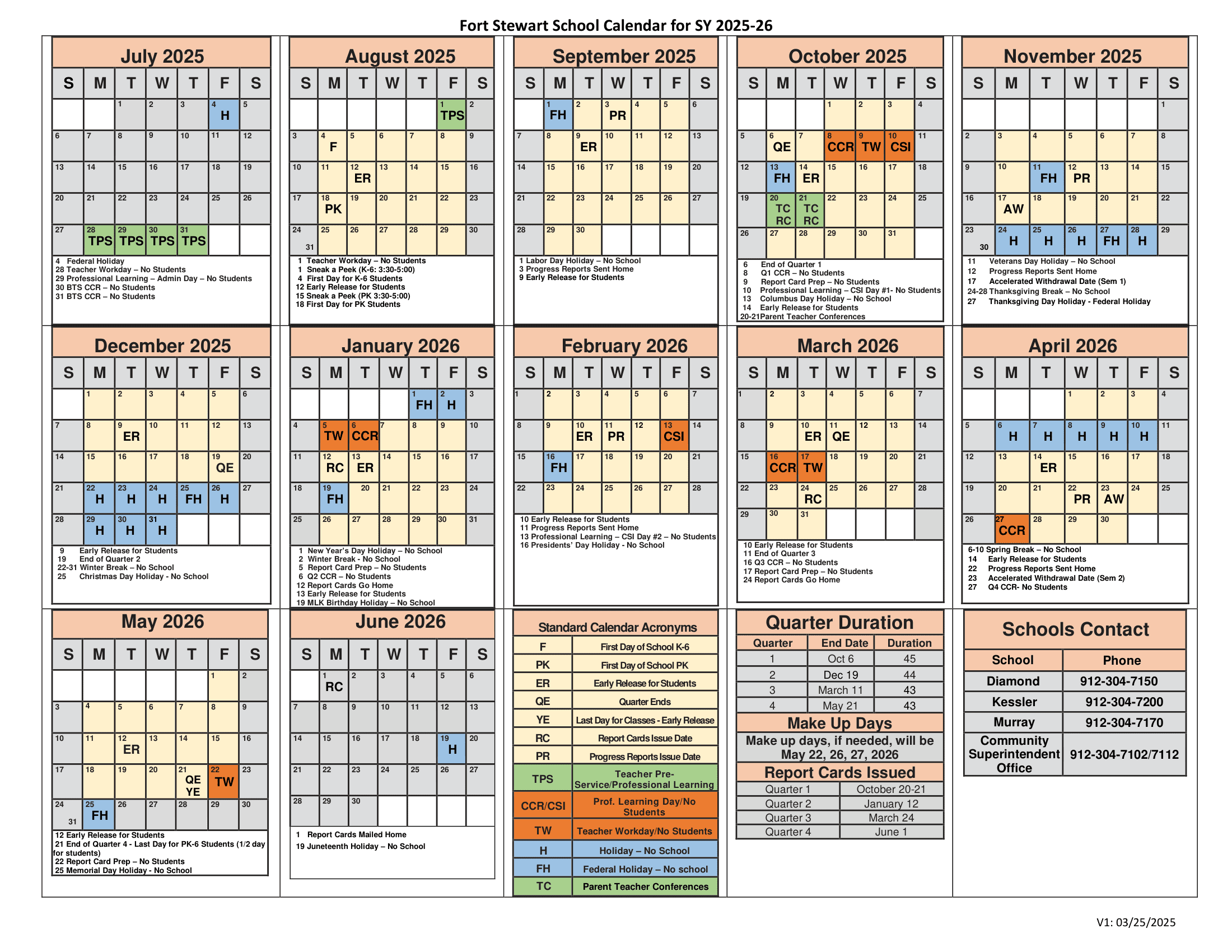 Dates are sourced from the official Fort Stewart School Calendar 25-26 Revised [PDF] website. Dates may change at the discretion of the district. Always verify with the official school website for the latest updates.