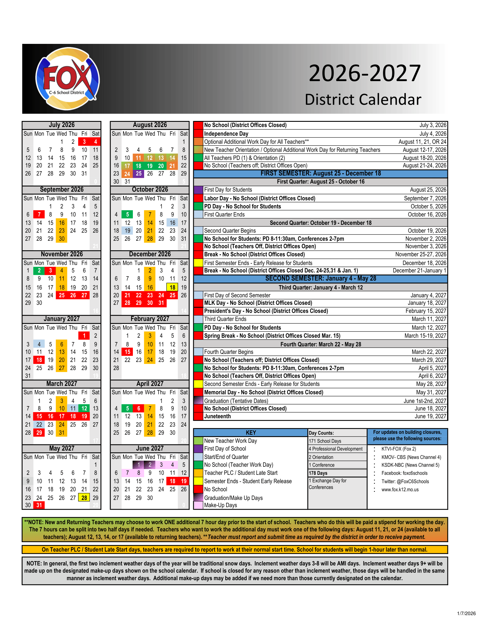 Dates are sourced from the official Fox C-6 School District School Calendar 26-27 Revised website. Dates may change at the discretion of the district. Always verify with the official school website for the latest updates.