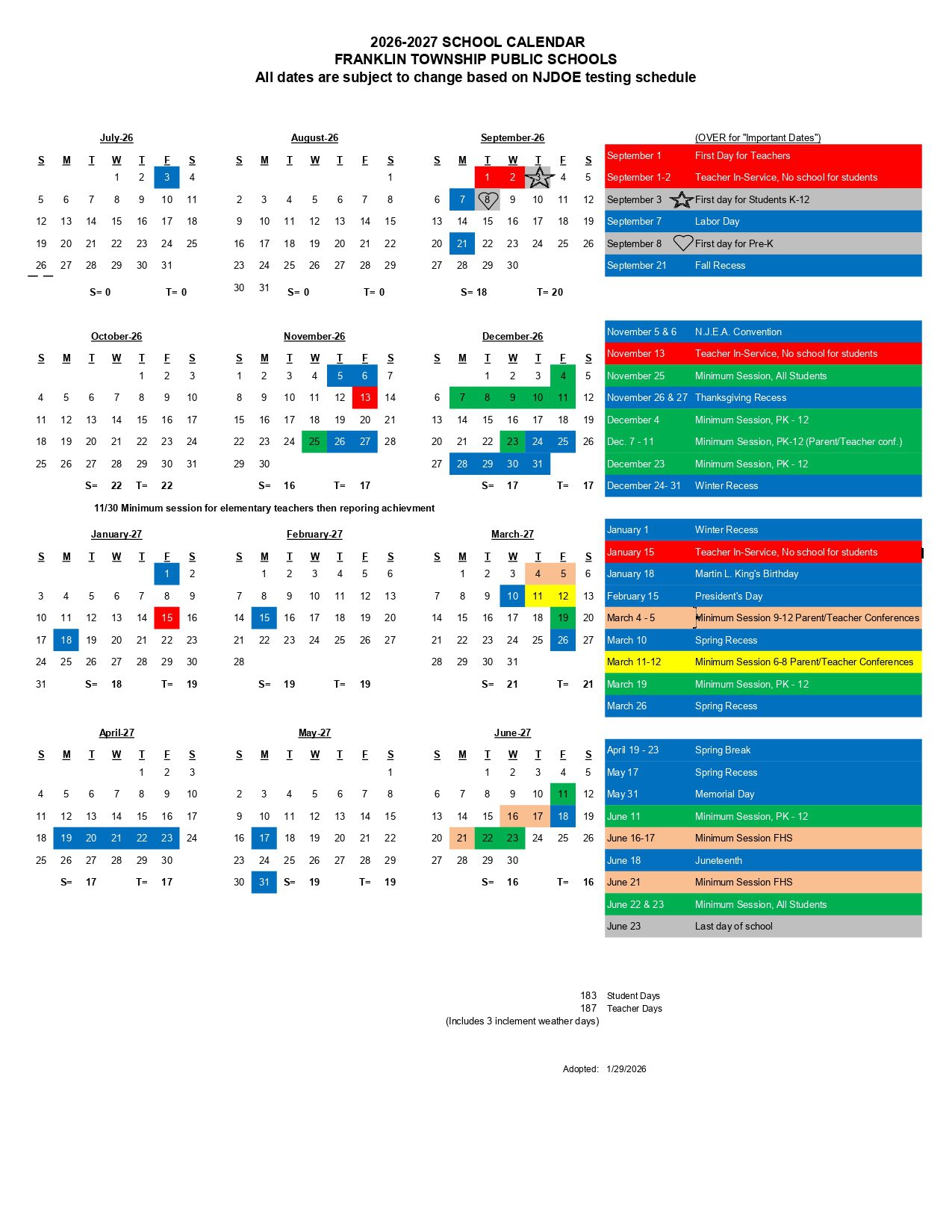 FRANKLIN TOWNSHIP PUBLIC SCHOOLS Calendar 2026-2027