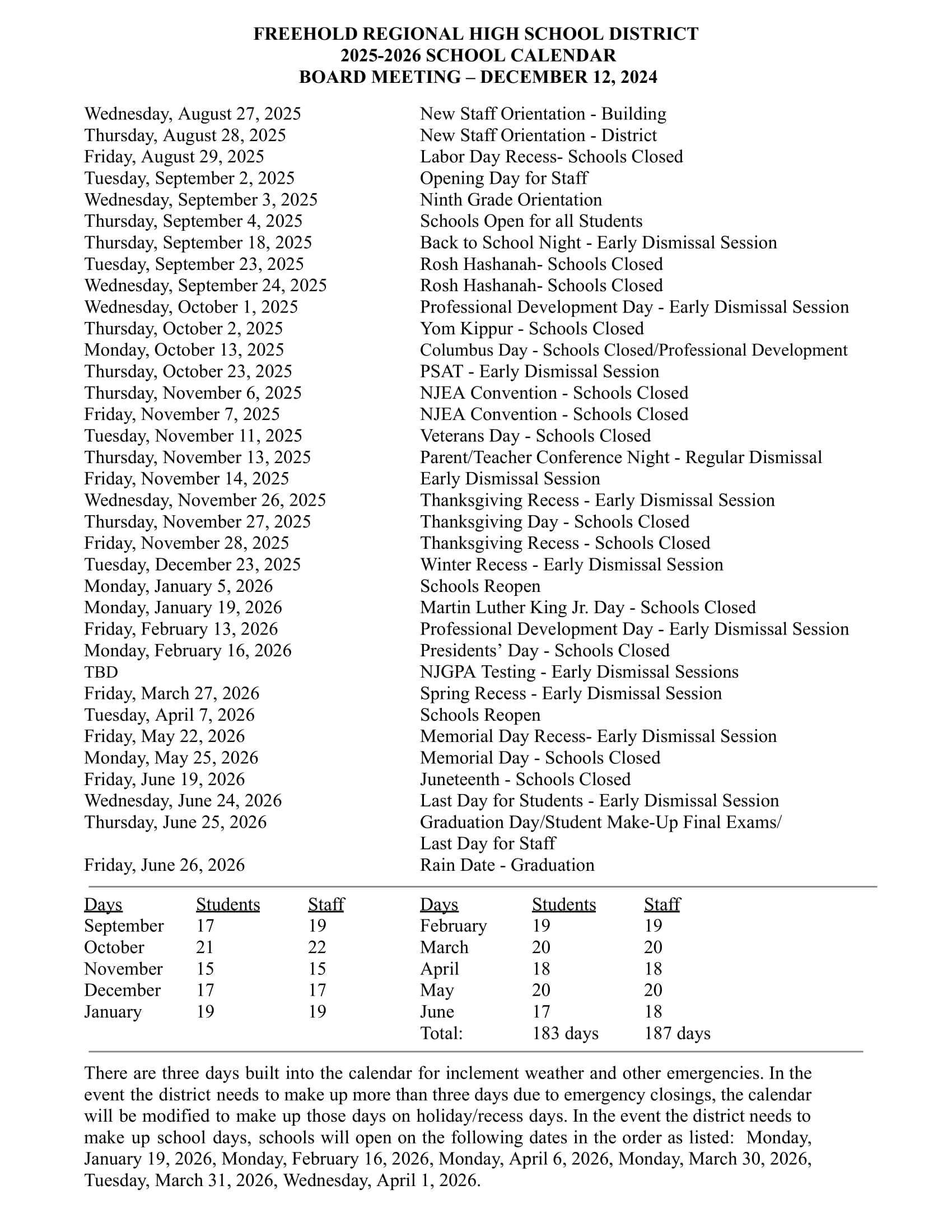 FREEHOLD REGIONAL HIGH SCHOOL DISTRICT 2025-2026 School Calendar FAQ