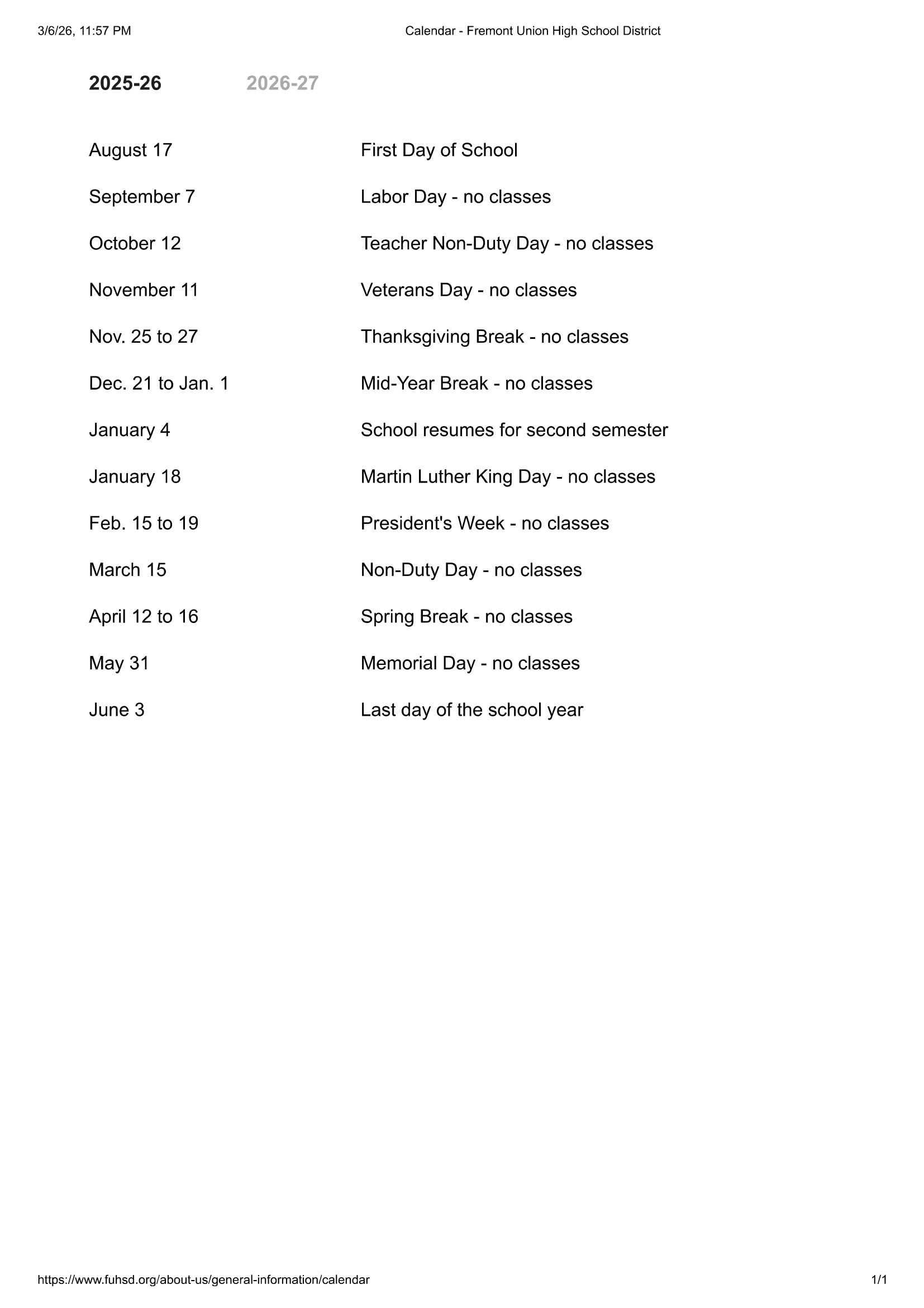 Dates are sourced from the official Fremont Union High School District 26-27 Calendar [PDF] website. Dates may change at the discretion of the district. Always verify with the official school website for the latest updates.