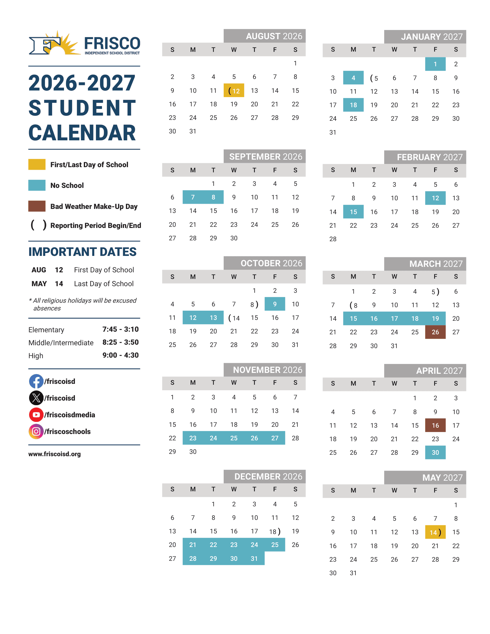Dates are sourced from the official Frisco ISD Independent School District Calendar 26-27 [PDF] website. Dates may change at the discretion of the district. Always verify with the official school website for the latest updates.