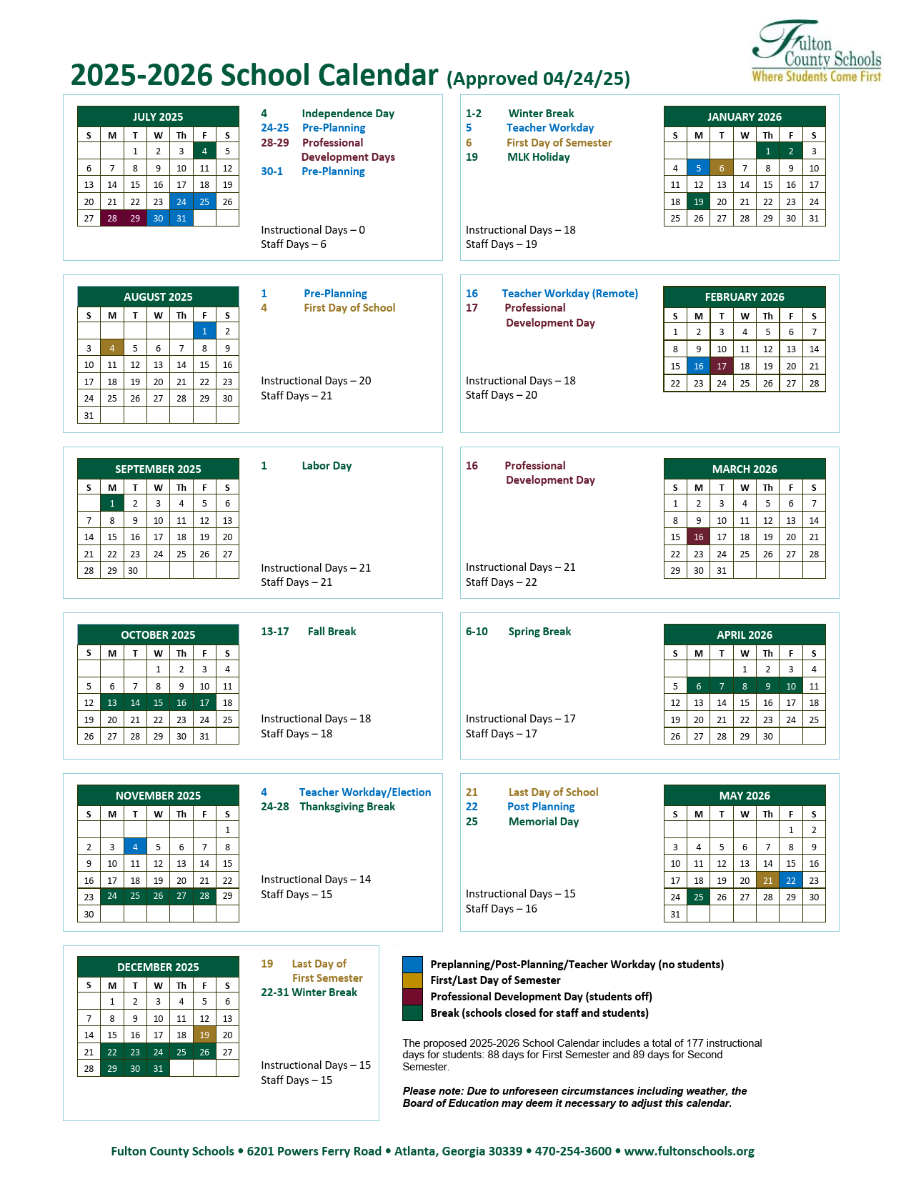 The school calendar provided on this page is taken from the official Fulton County GA School District website. Please note that all dates and events are subject to change at the discretion of the school district. For the most accurate and updated information, please refer to the official district website or contact the school helpline.