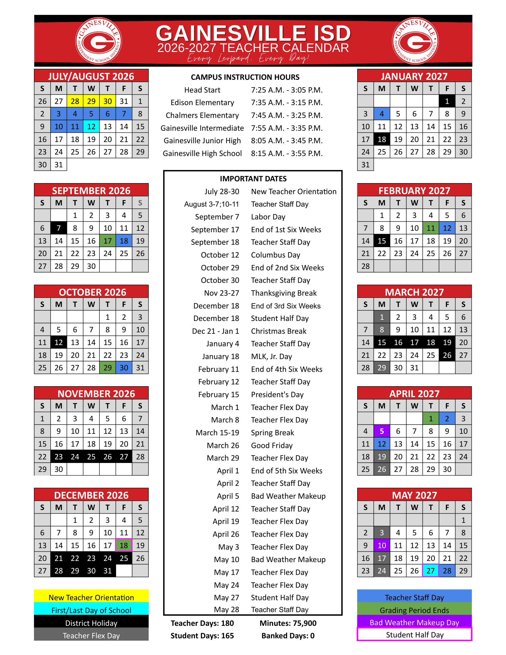 Dates are sourced from the official Gainesville ISD 26-27 calendar 26-27 Revised [PDF] website. Dates may change at the discretion of the district. Always verify with the official school website for the latest updates.