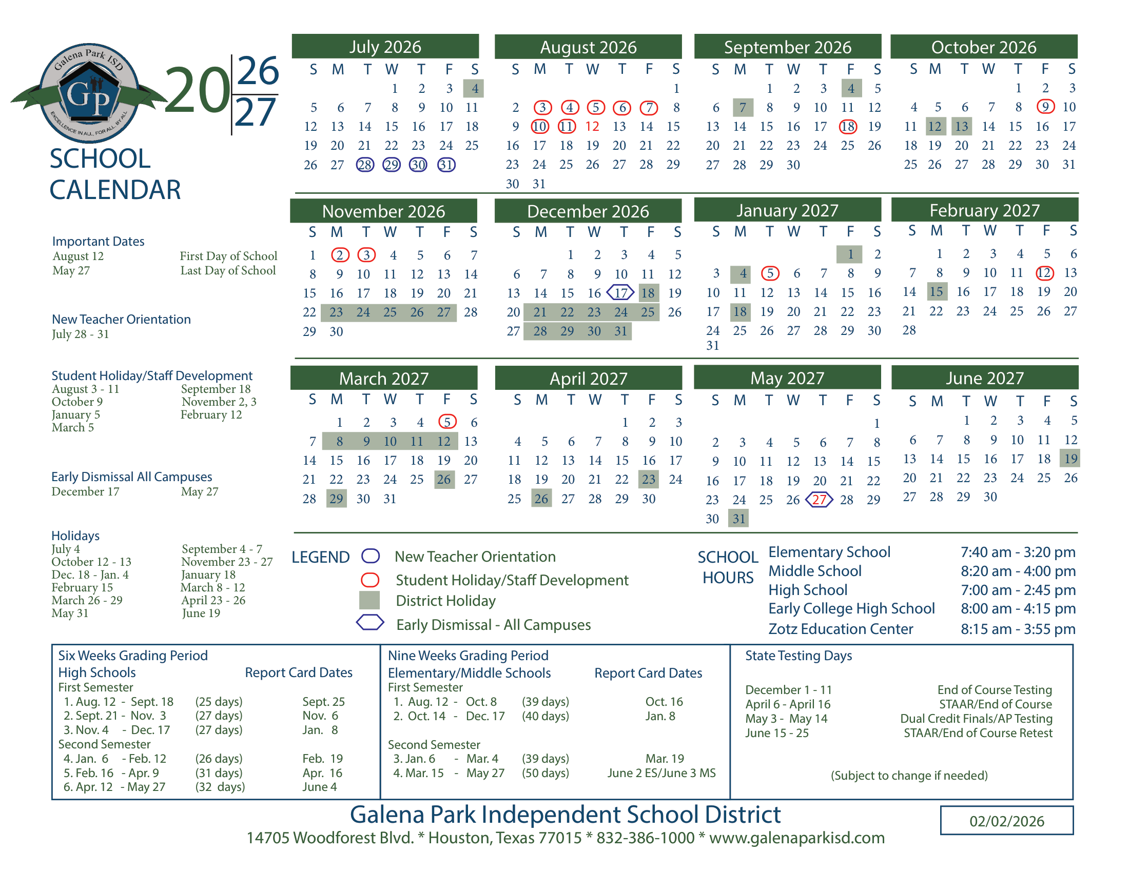 Dates are sourced from the official Galena Park ISD Calendar 26-27 Updated website. Dates may change at the discretion of the district. Always verify with the official school website for the latest updates.