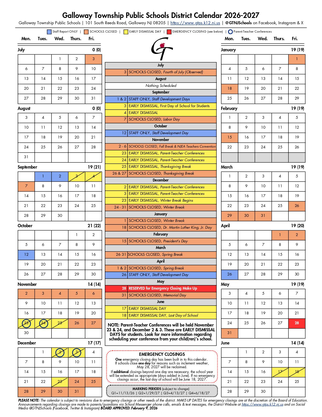 Galloway Township Public Schools Calendar (2026-2027)