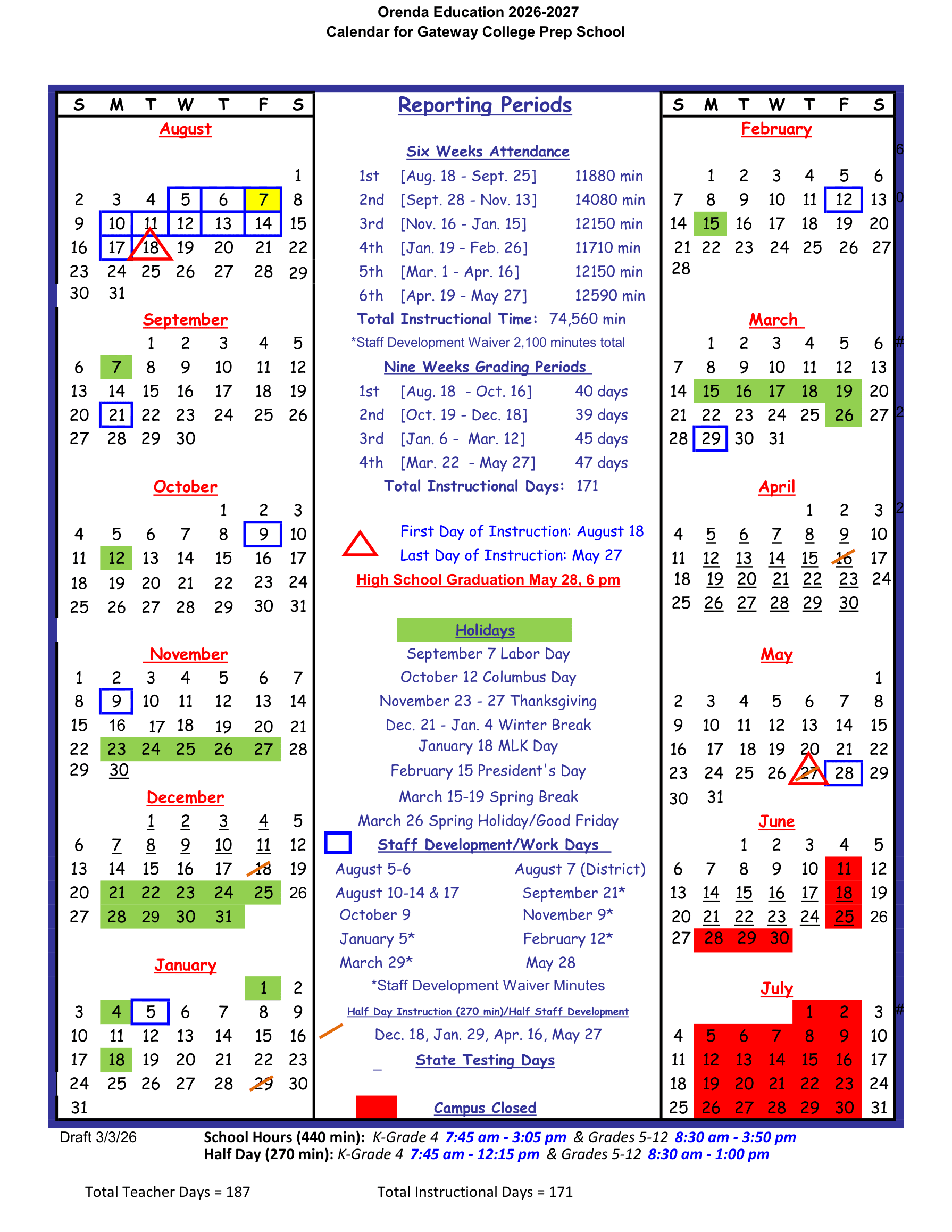 Gateway College Prep School Calendar (2026-2027)