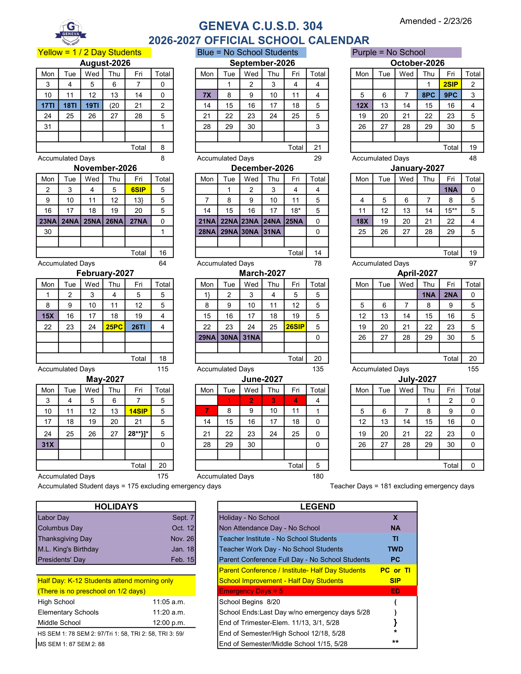Geneva C.U.S.D. 304 Calendar (2026-2027)