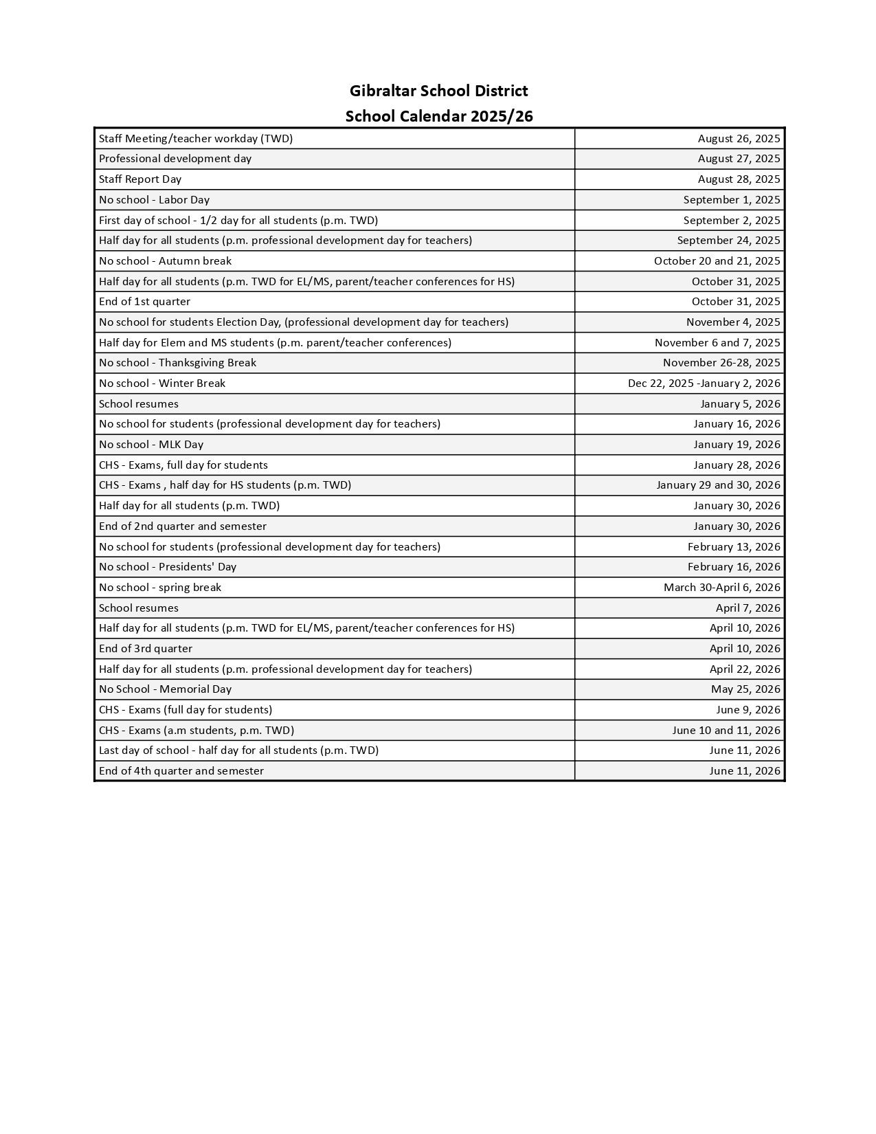 The school calendar provided on this page is taken from the official Gibraltar School District MI Michigan School District website. Please note that all dates and events are subject to change at the discretion of the school district. For the most accurate and updated information, please refer to the official district website or contact the school helpline.