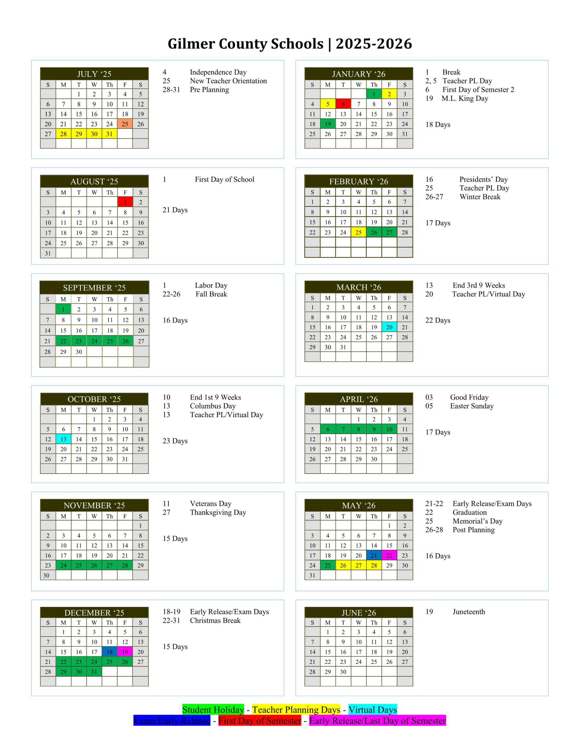 The school calendar provided on this page is taken from the official Gilmer County GA School District website. Please note that all dates and events are subject to change at the discretion of the school district. For the most accurate and updated information, please refer to the official district website or contact the school helpline.