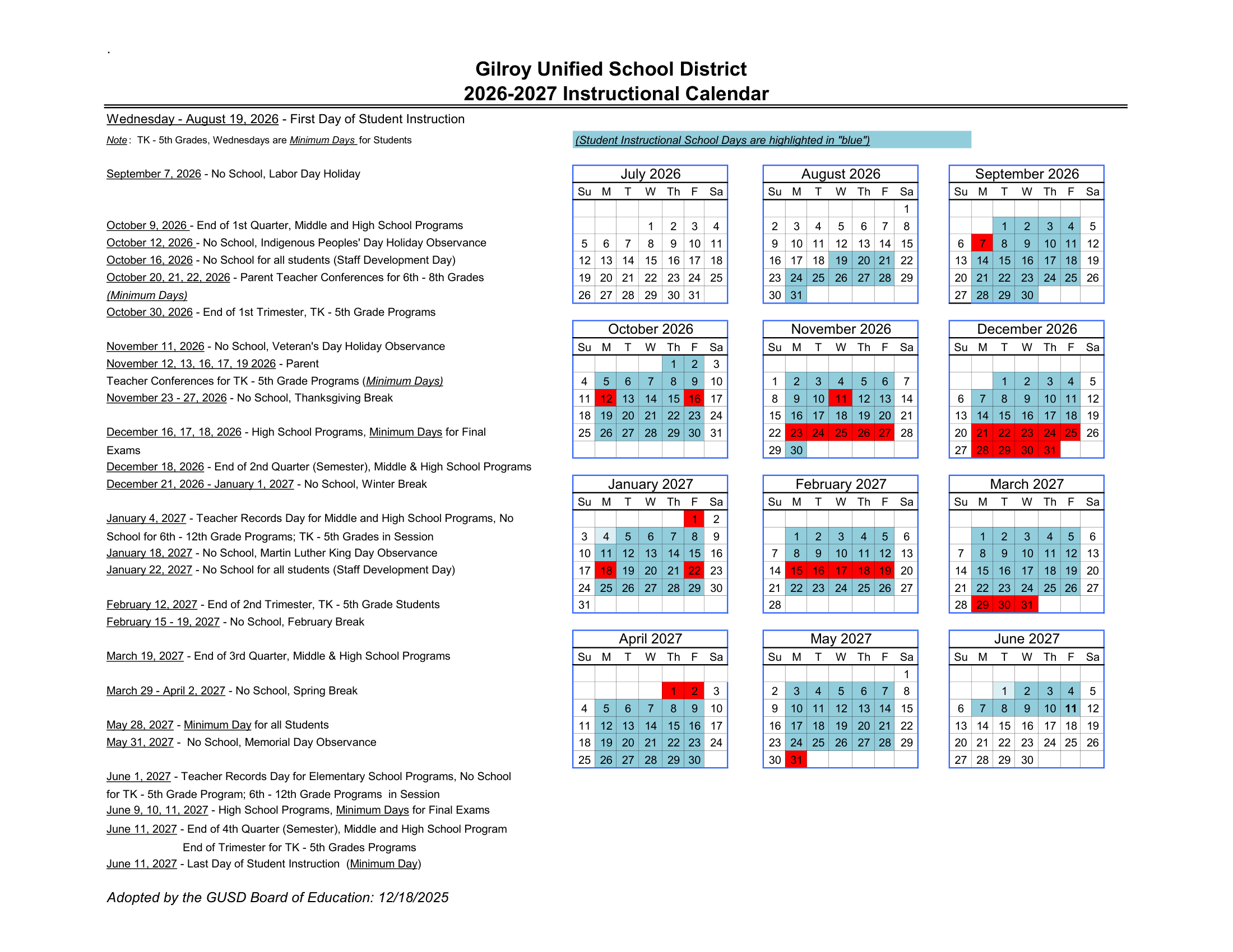Dates are sourced from the official Gilroy GUSD Unified School District 26-27 Calendar [PDF] website. Dates may change at the discretion of the district. Always verify with the official school website for the latest updates.