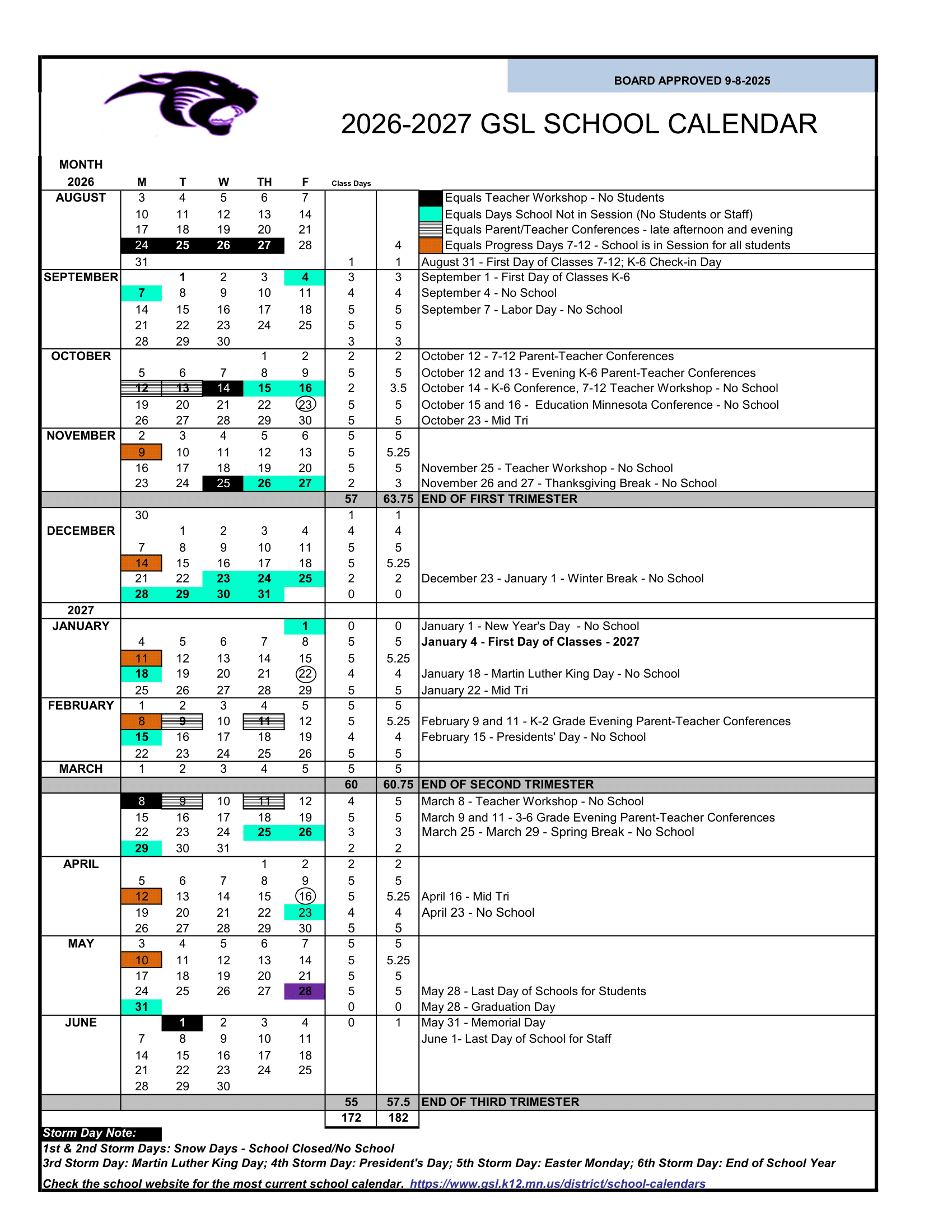 Dates are sourced from the official Glencoe-Silver Lake Public Schools GSL School 26-27 Calendar [PDF] Updated website. Dates may change at the discretion of the district. Always verify with the official school website for the latest updates.