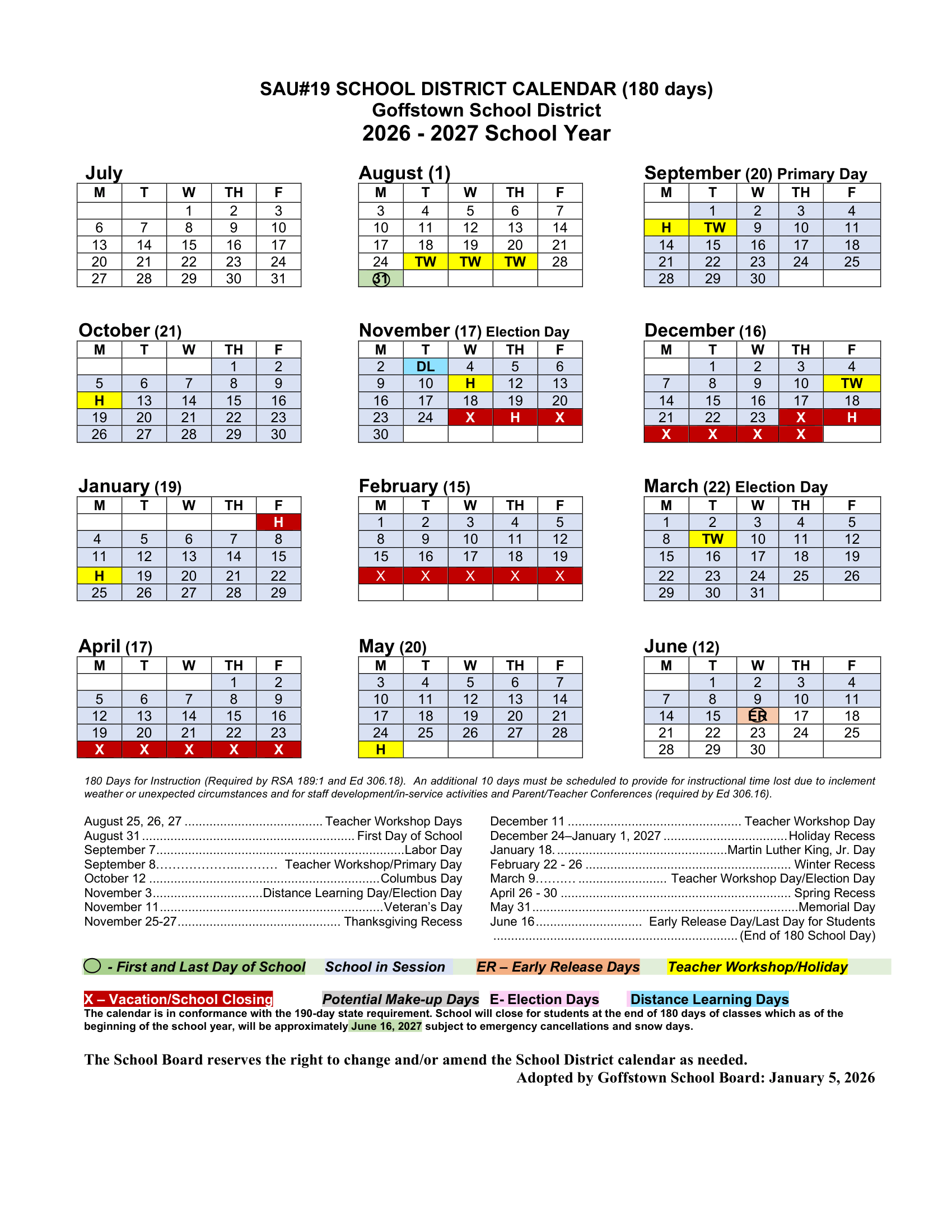Goffstown School District Calendar (2026-2027)