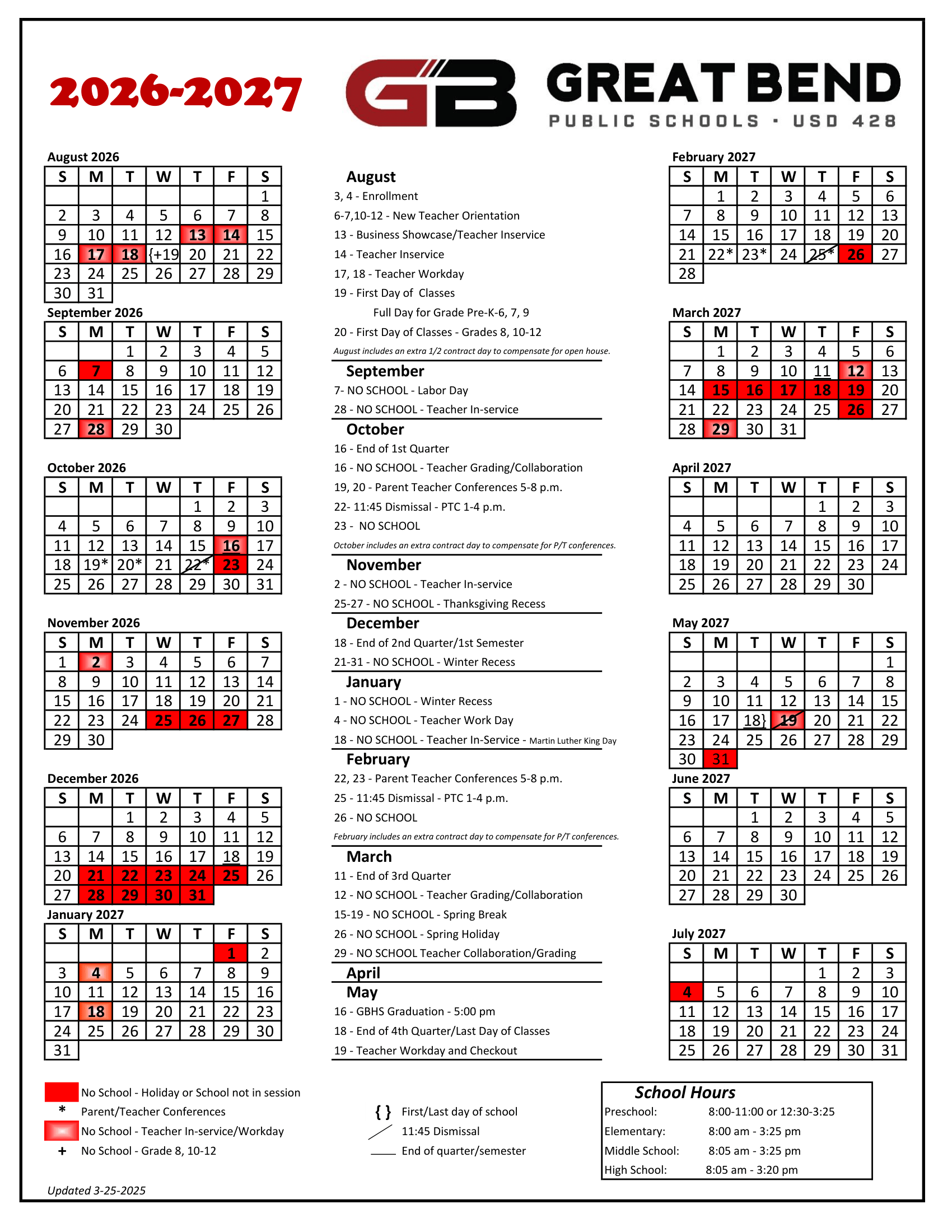 Dates are sourced from the official Great Bend Public Schools USD 428 26-27 Calendar Updated [PDF] website. Dates may change at the discretion of the district. Always verify with the official school website for the latest updates.