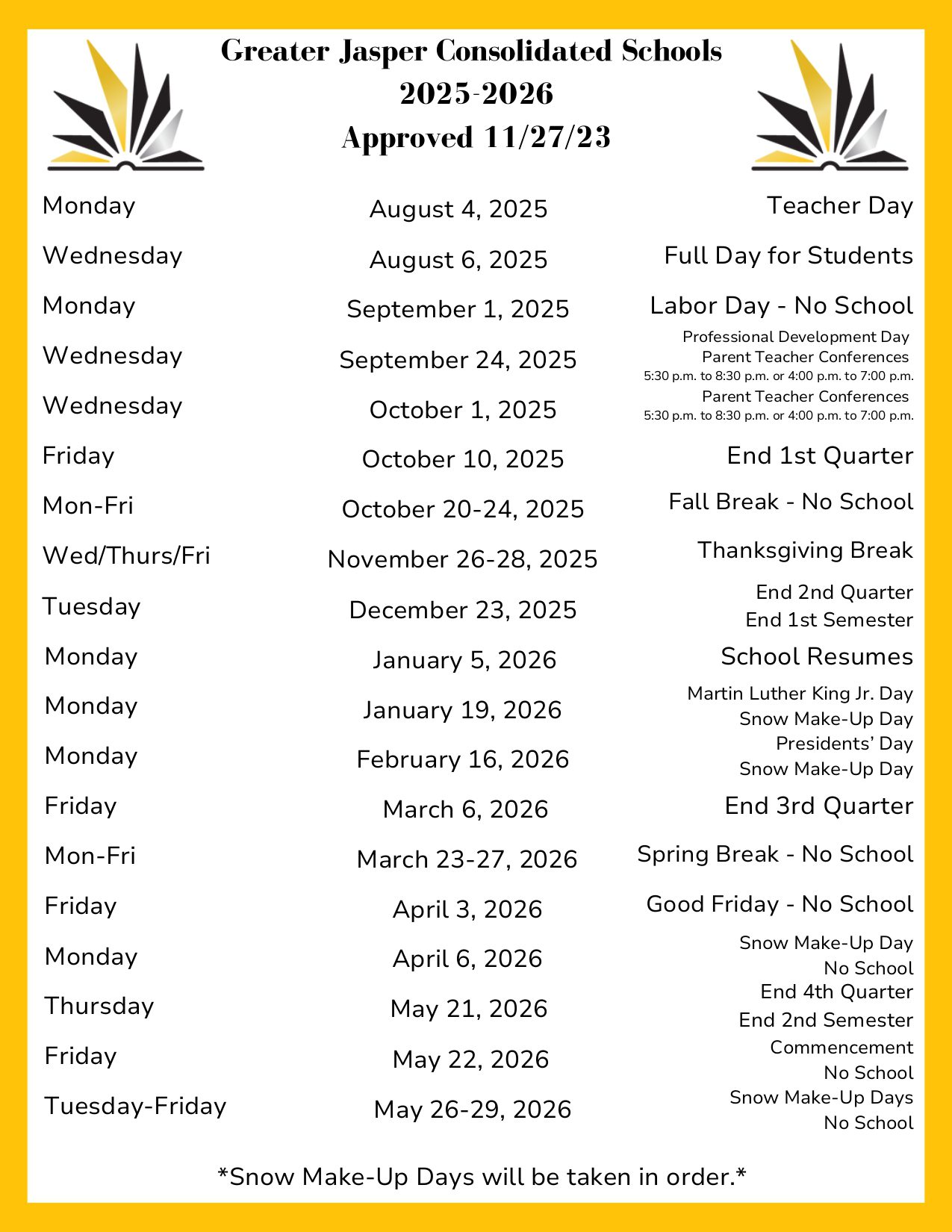 May 26-29, 2026Snow Make-Up Days / No School