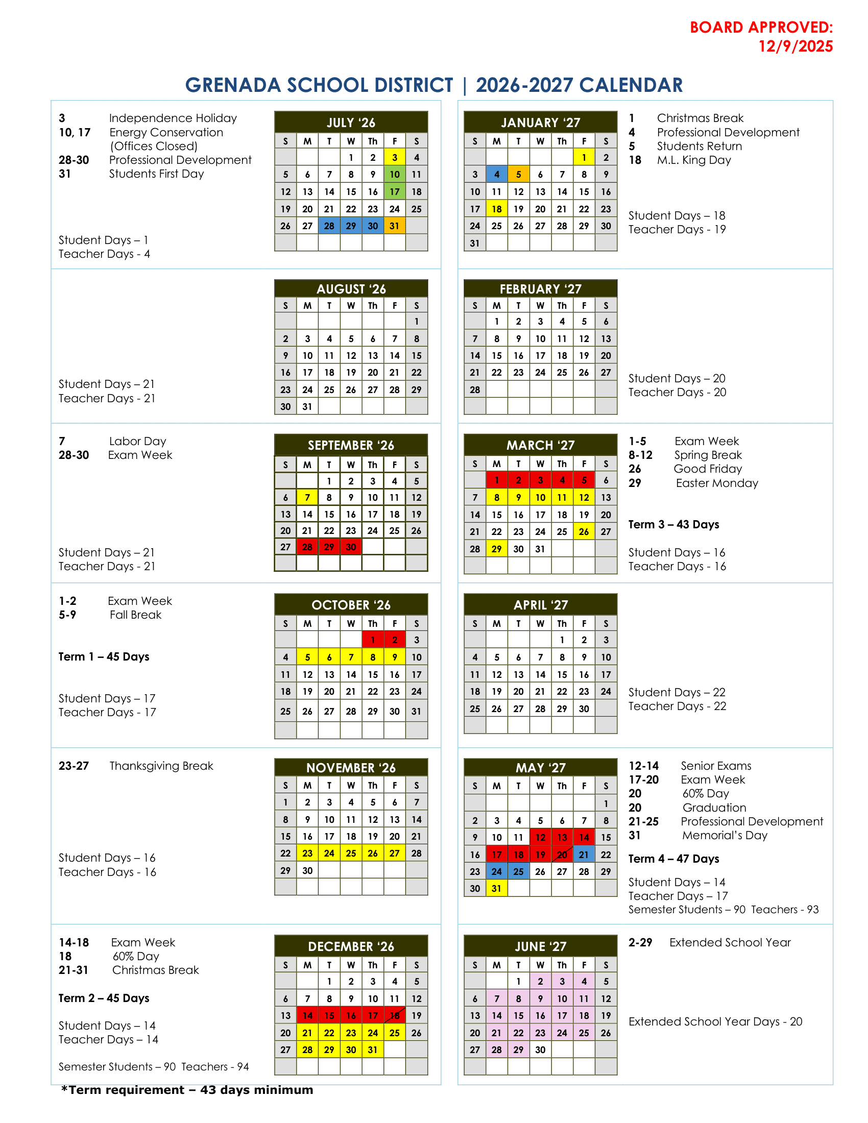 Grenada School District Calendar (2026-2027)