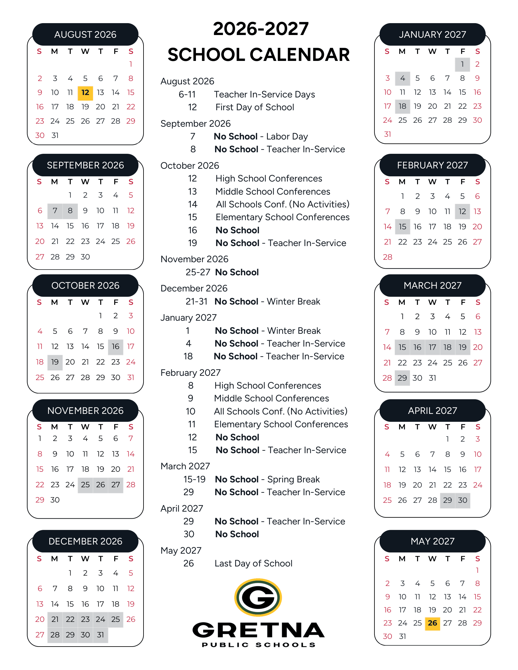 Dates are sourced from the official Gretna Public Schools Calendar 26-27 Revised [PDF] website. Dates may change at the discretion of the district. Always verify with the official school website for the latest updates.