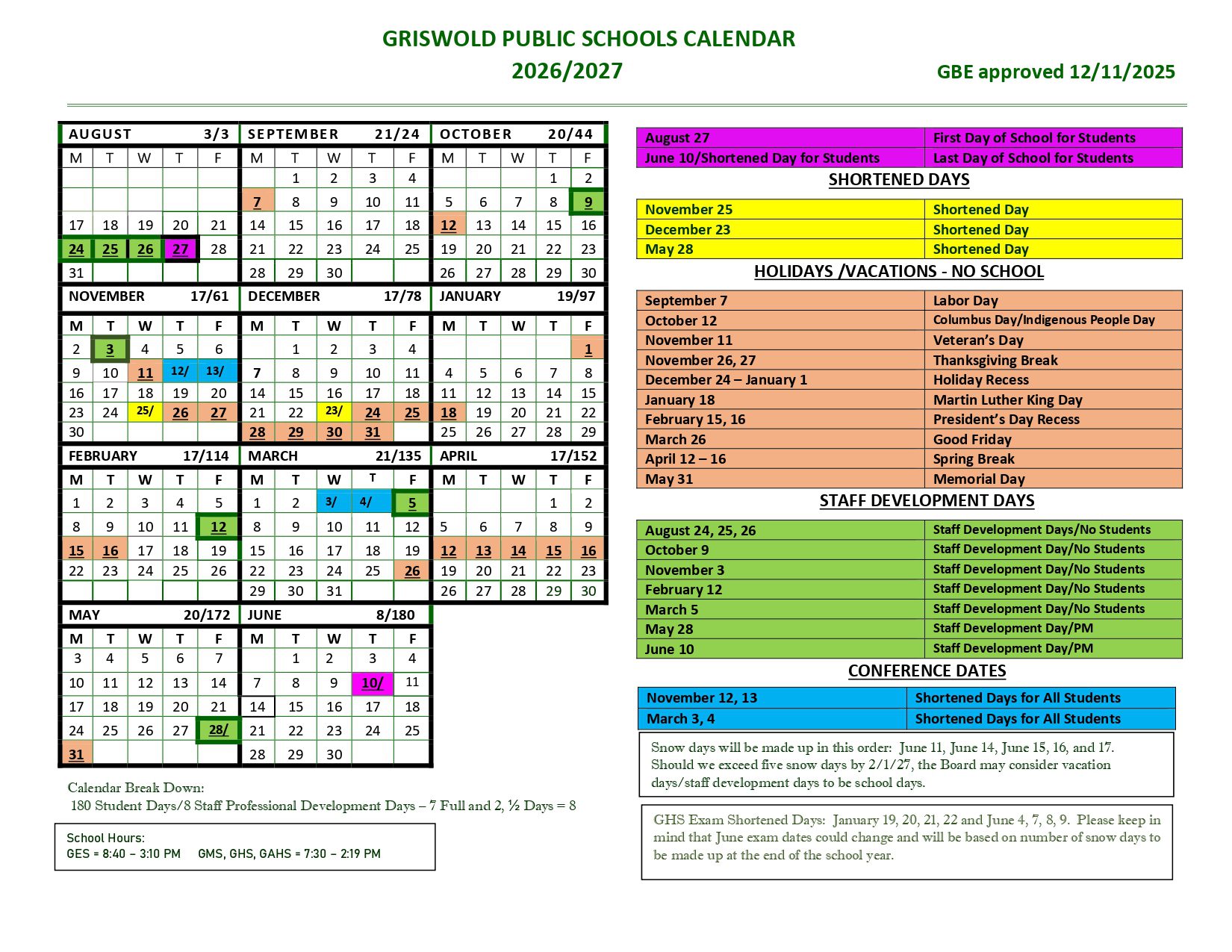Dates are sourced from the official Griswold Public Schools ct Calendar 26-27 Revised PDF website. Dates may change at the discretion of the district. Always verify with the official school website for the latest updates.