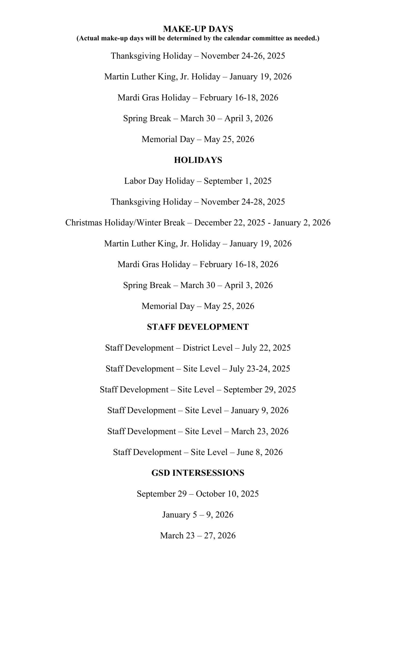 GSD Intersessions are from September 29-October 10, 2025, January 5-9, 2026, and March 23-27, 2026.