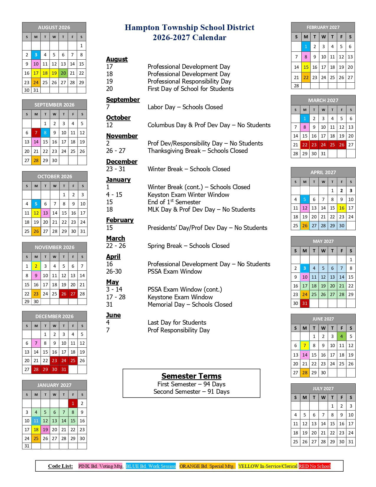 The Printable school calendar provided on this page is taken from the official Hampton Township School District PA Calendar 26-27 Updates. Please note that all dates and events are subject to change at the discretion of the school district. For the most accurate and updated information, please refer to the official district website or contact the school helpline.