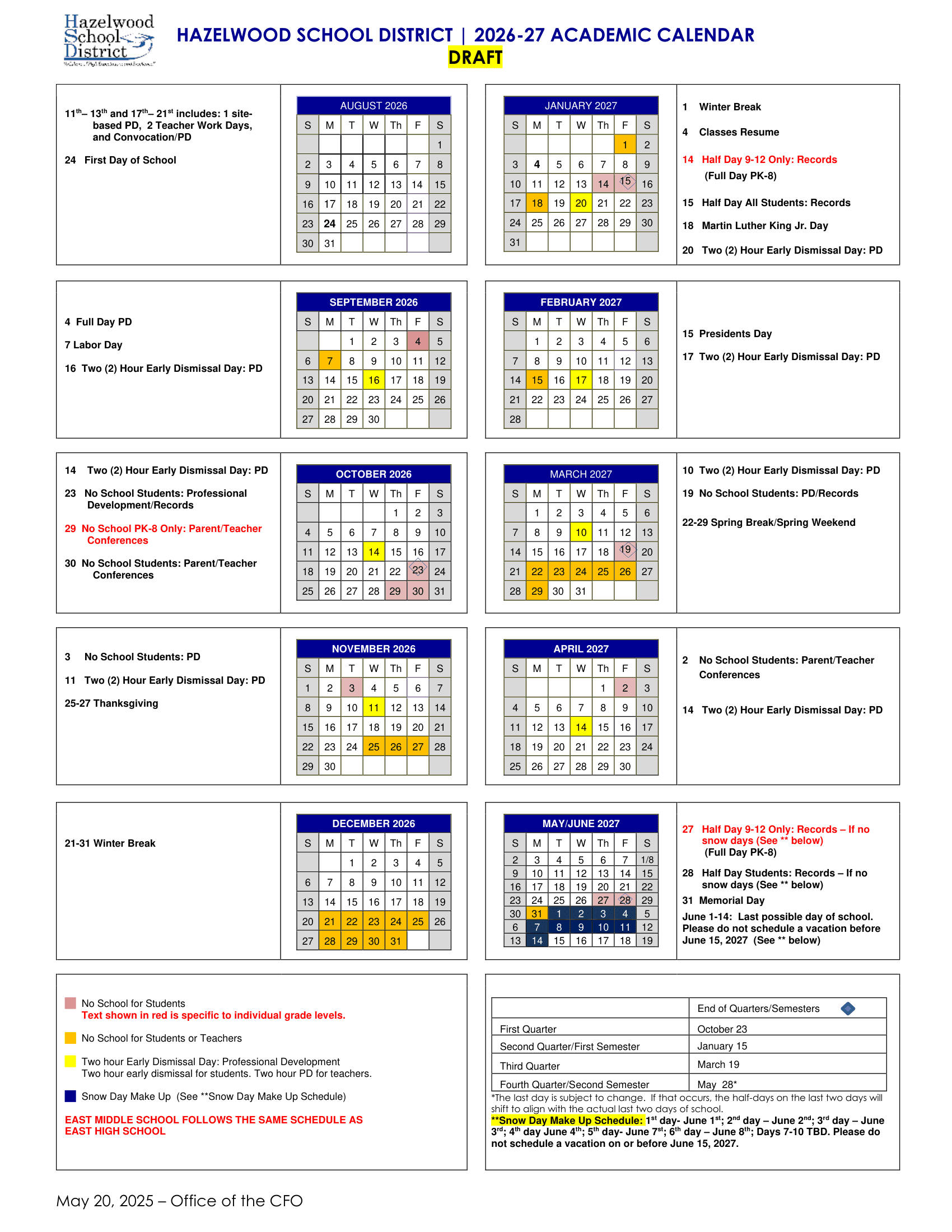 Dates are sourced from the official Hazelwood School District 26-27 Calendar Revised website. Dates may change at the discretion of the district. Always verify with the official school website for the latest updates.