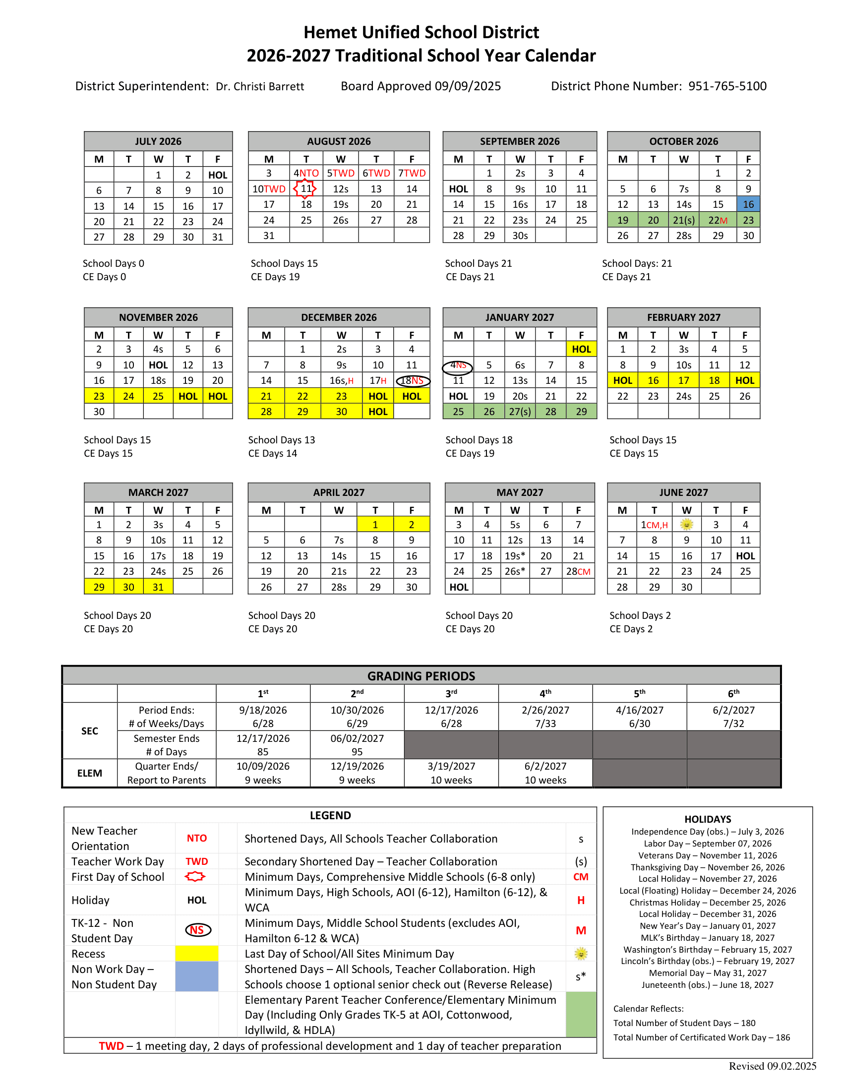 Dates are sourced from the official Hemet USD Calendar 26-27 Revised [PDF] website. Dates may change at the discretion of the district. Always verify with the official school website for the latest updates.