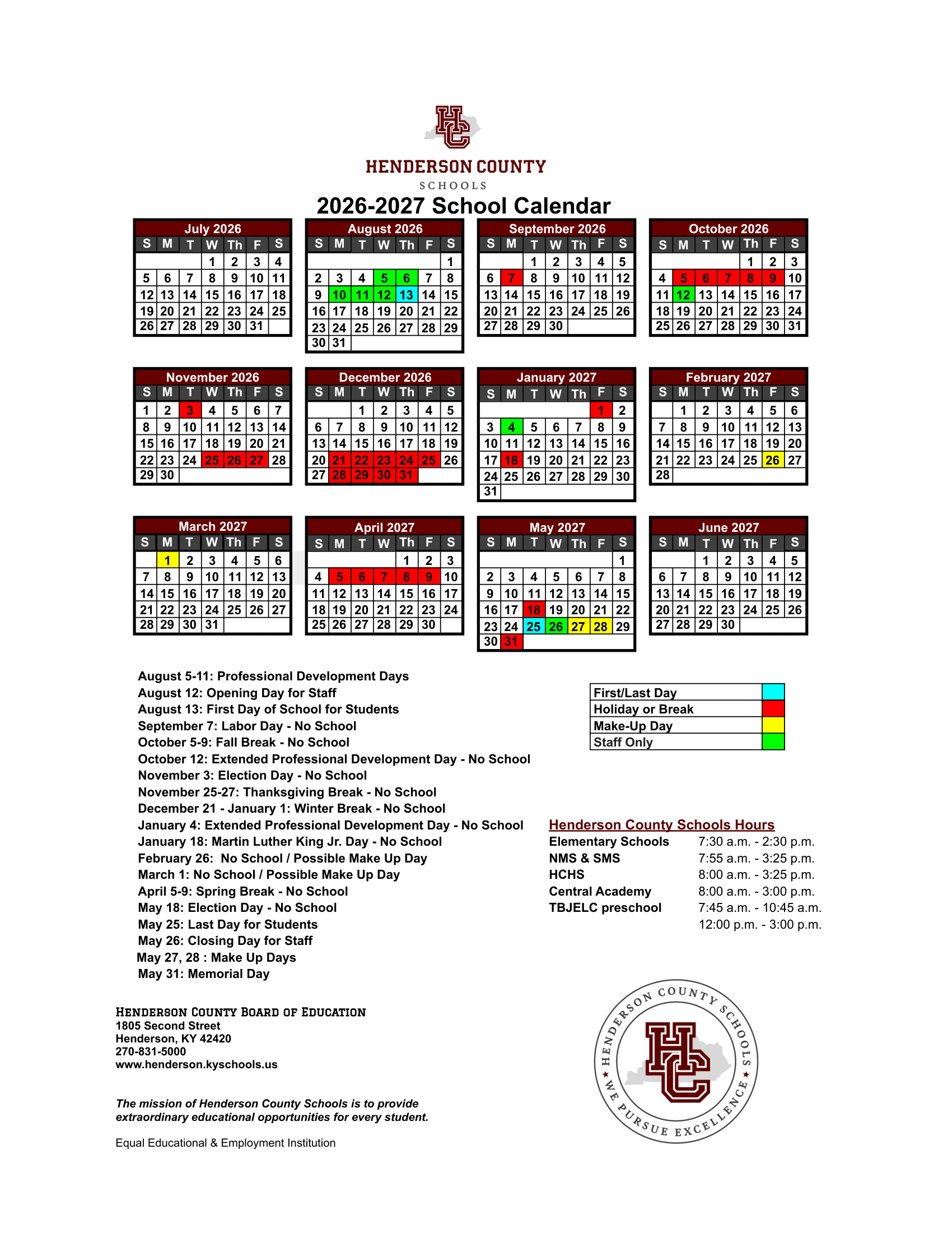 Dates are sourced from the official Henderson County Schools ky 26-27 Calendar Updates[PDF] website. Dates may change at the discretion of the district. Always verify with the official school website for the latest updates.