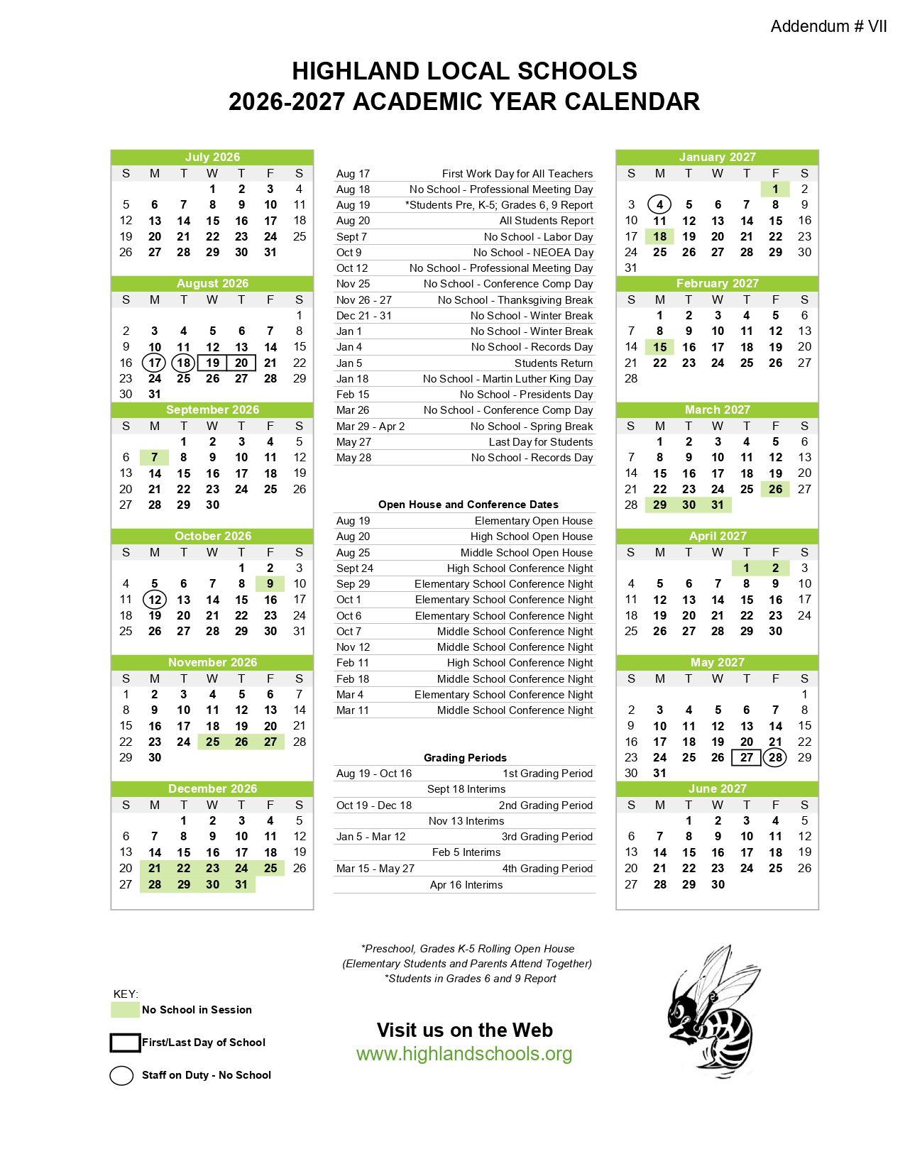 HIGHLAND LOCAL SCHOOLS Calendar (2026-2027)