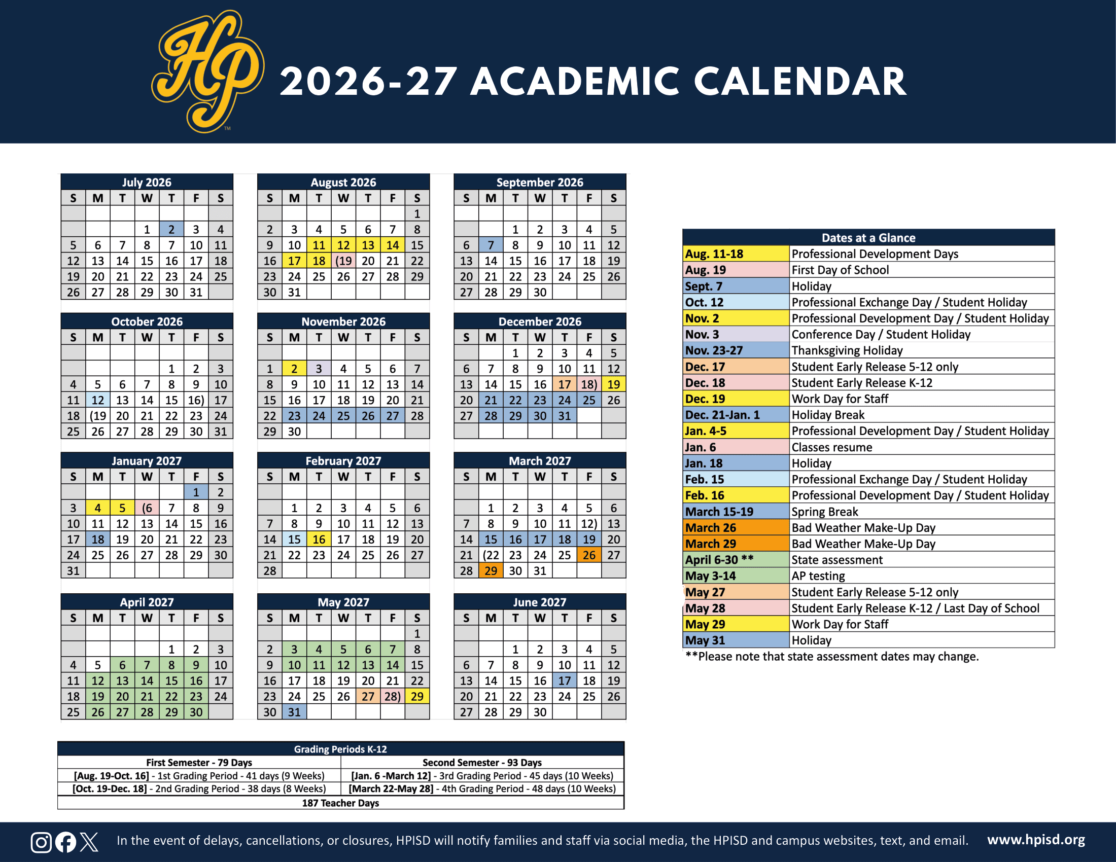Dates are sourced from the official Highland Park ISD 26-27 Revised [PDF] website. Dates may change at the discretion of the district. Always verify with the official school website for the latest updates.