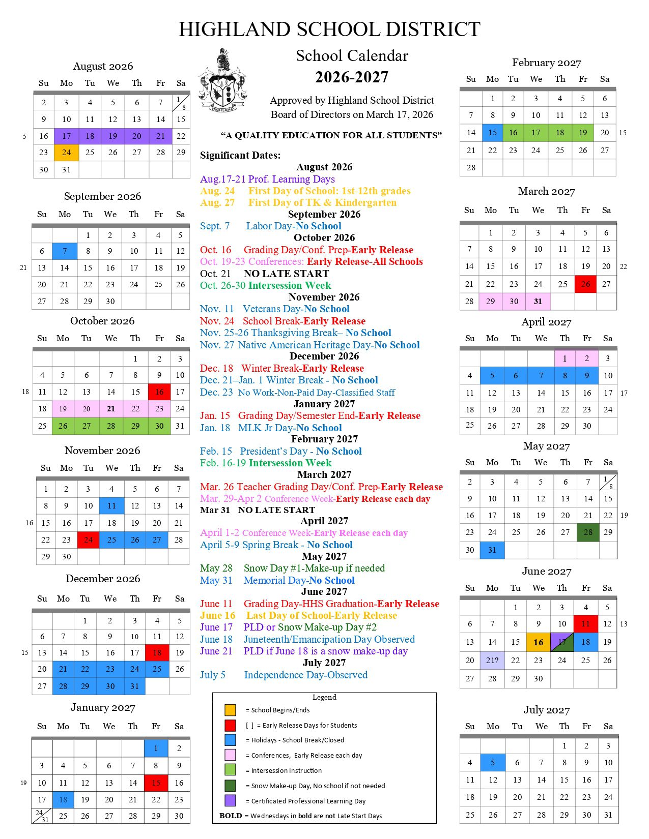 HIGHLAND SCHOOL DISTRICT Calendar (2026-2027)