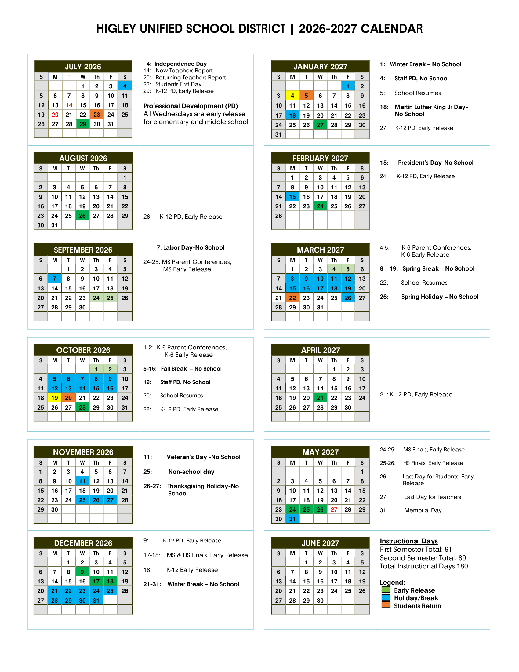 Higley Unified School District Calendar 2026-2027