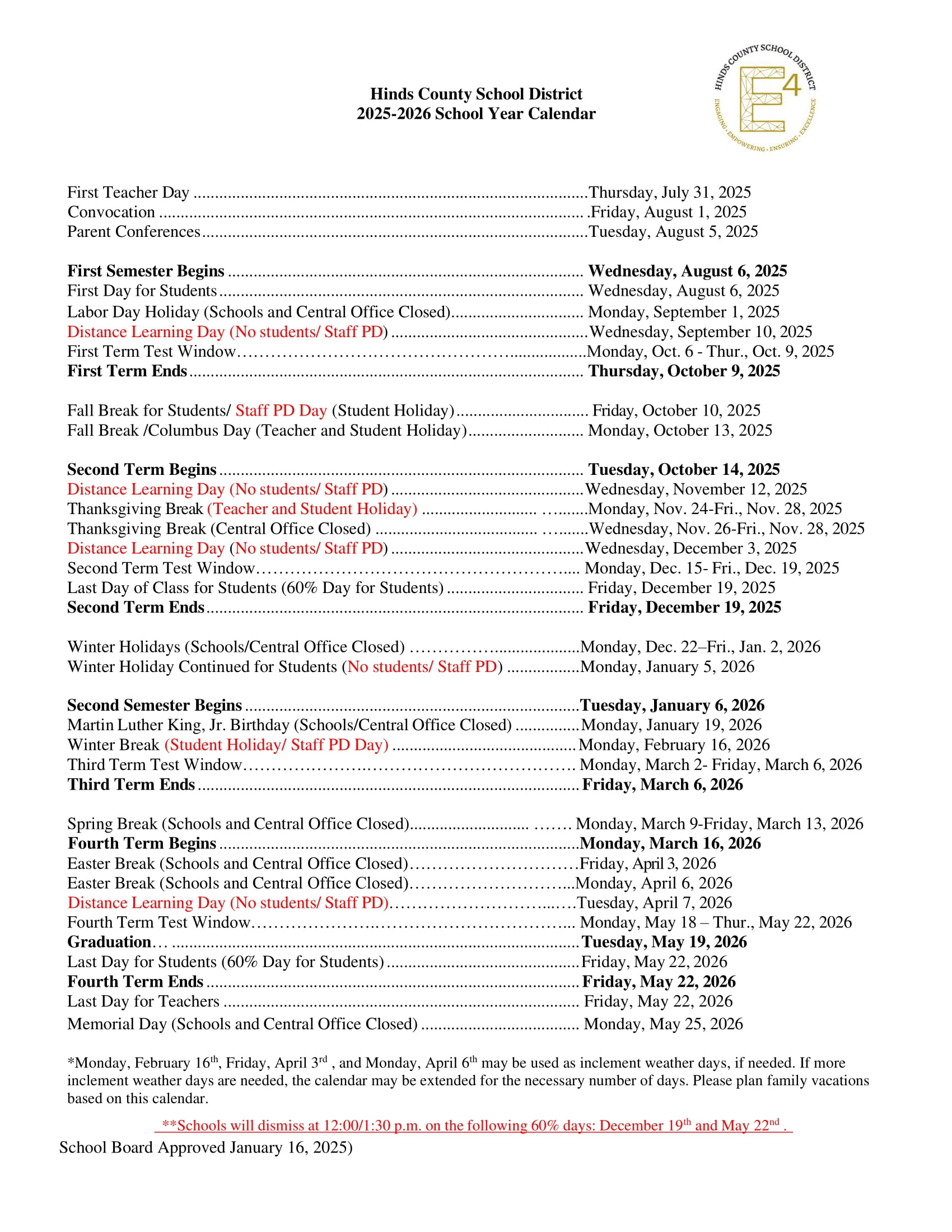 The printable school calendar provided on this page is taken from the official Hinds County School District Calendar website. Please note that all dates and events are subject to change at the discretion of the school district. For the most accurate and updated information, please refer to the official district website or contact the school helpline.