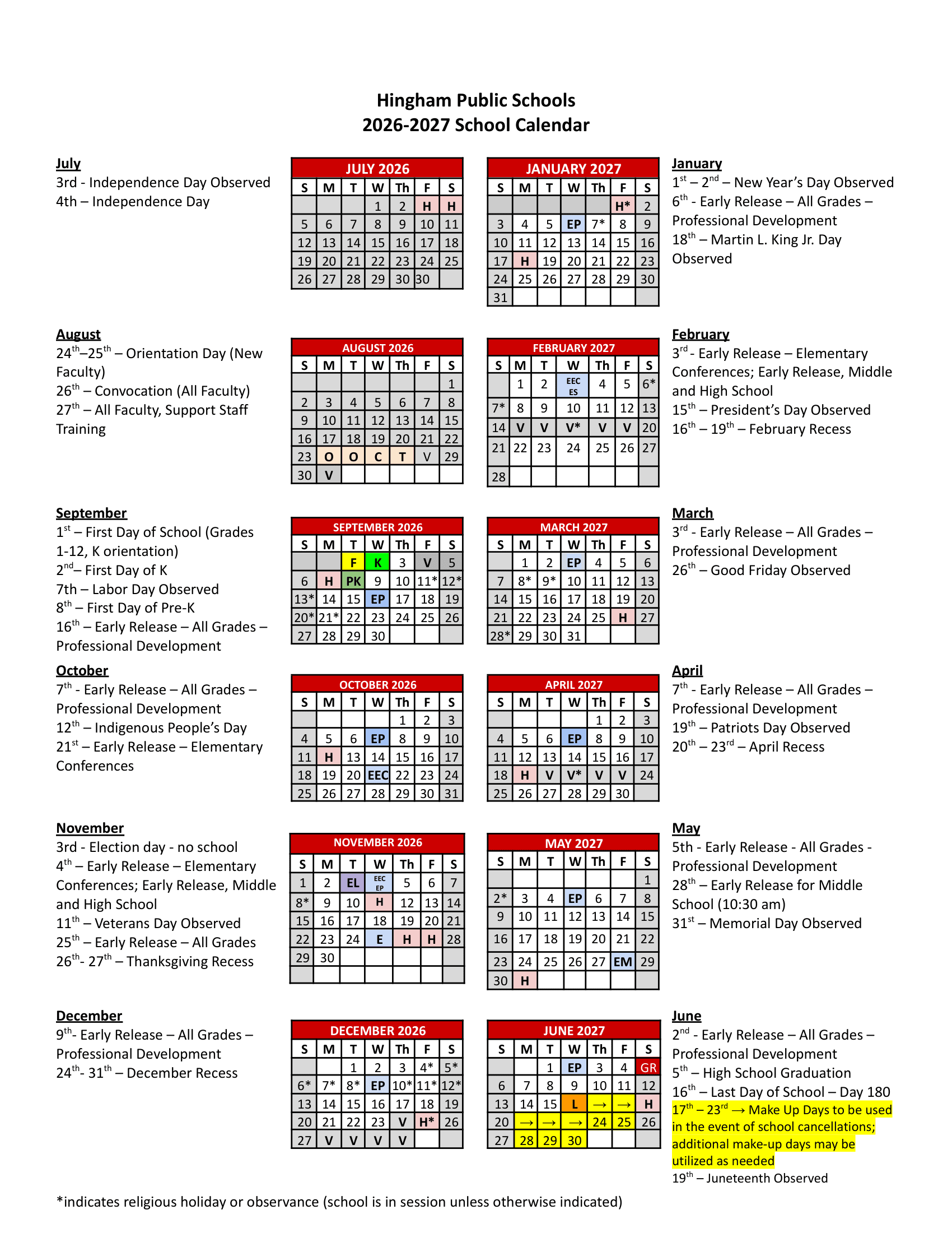 Hingham Public Schools Calendar (2026-2027)