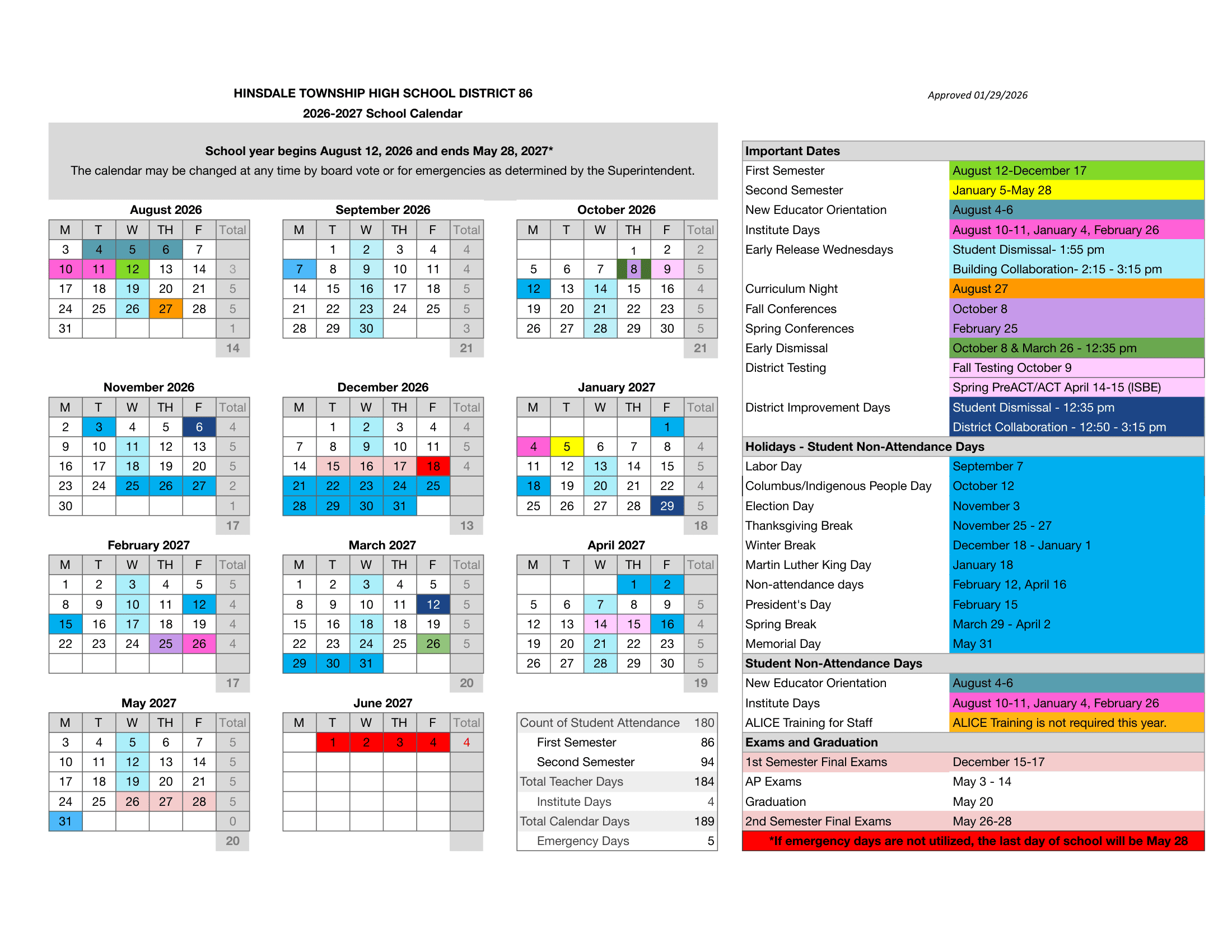 Dates are sourced from the official Hinsdale Township High School District 86 Calendar 26-27 [PDF] website. Dates may change at the discretion of the district. Always verify with the official school website for the latest updates.