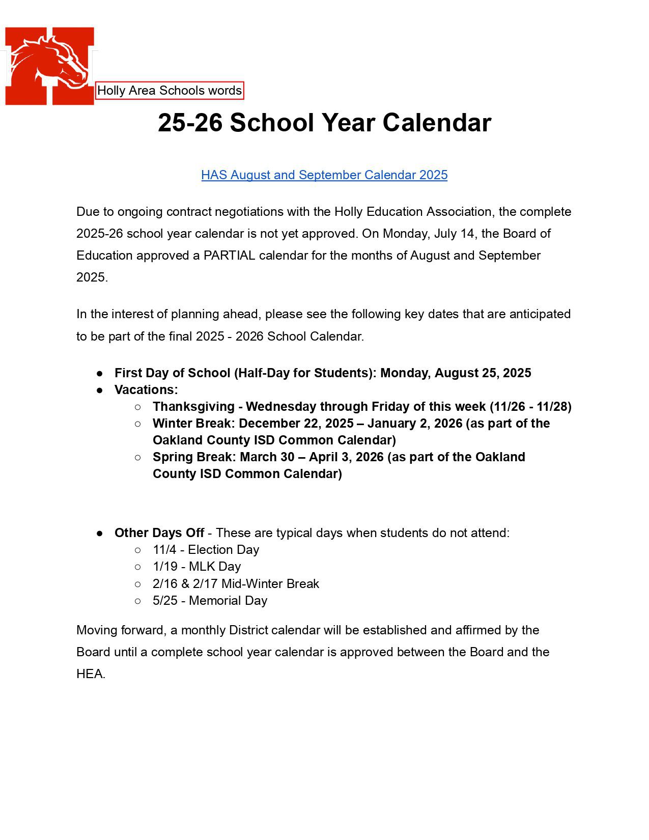 Holly Area Schools MI Calendar 25-26 Revised [pdf]