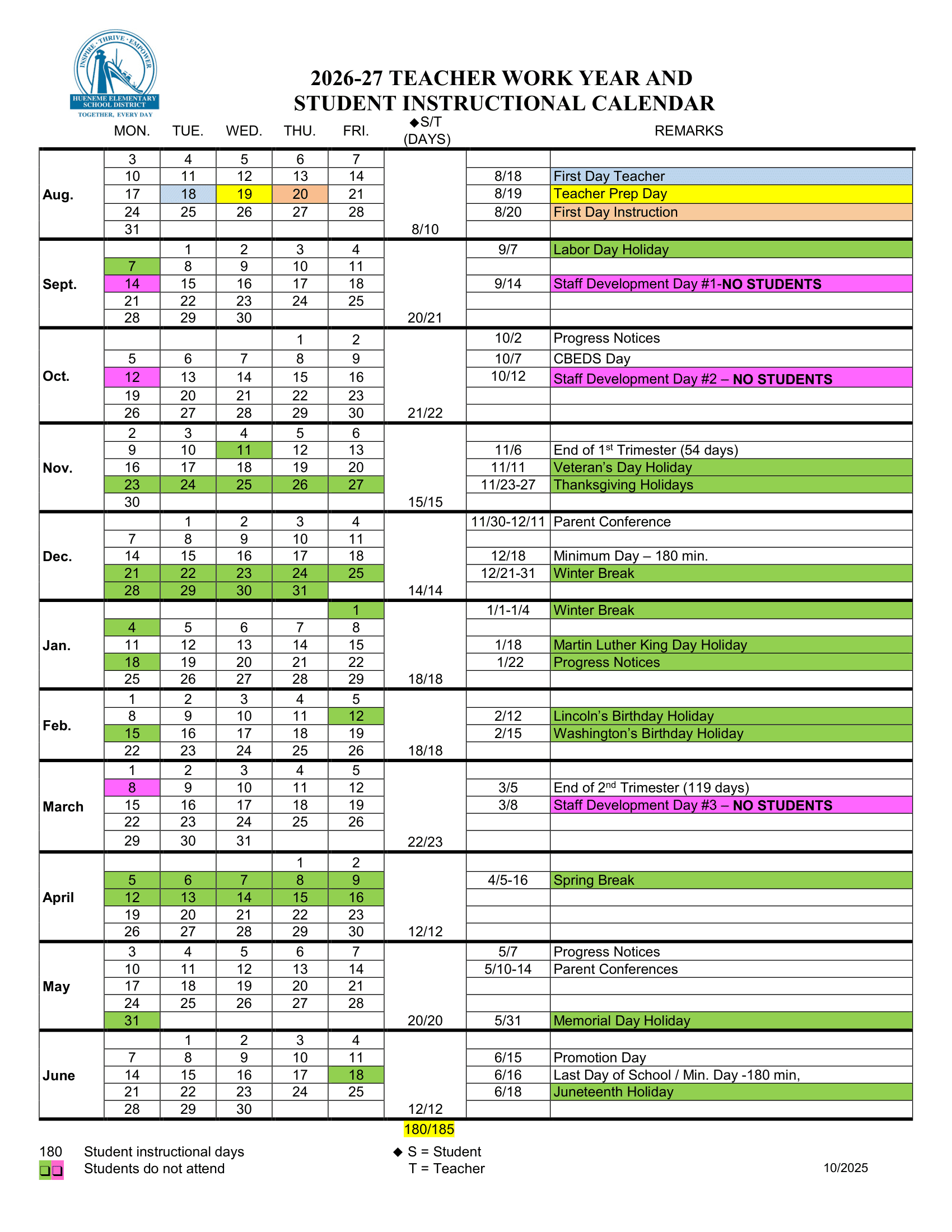| Oct 12, 2026 | Staff Development Day #2 – No Students |