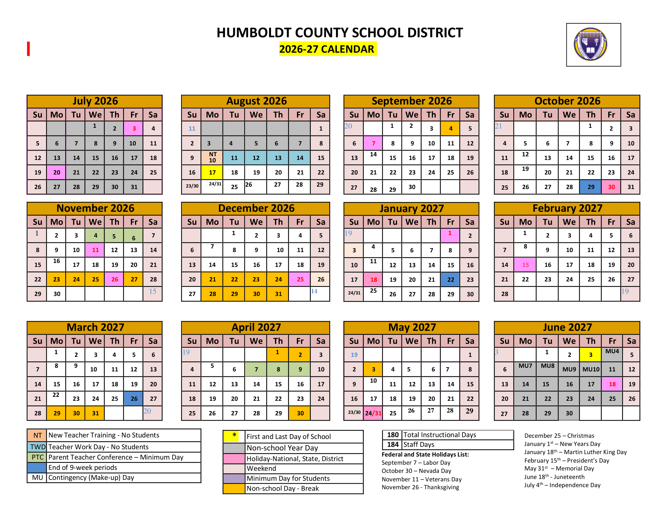 Dates are sourced from the official HUMBOLDT COUNTY SCHOOL DISTRICT 26-27 Calendar Revised [pdf] website. Dates may change at the discretion of the district. Always verify with the official school website for the latest updates.